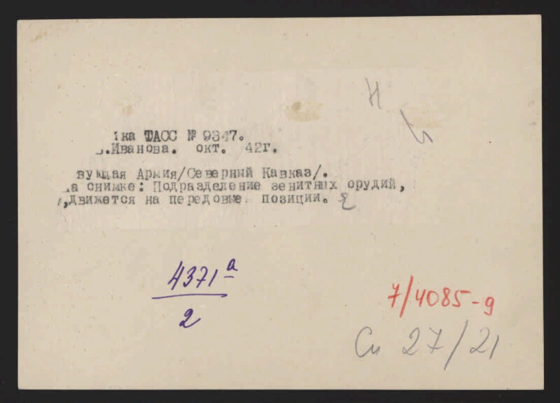 Действующая армия. Северный Кавказ. Подразделение зенитных орудий движется на передовые позиции : [фотография] / фото В. Иванова, ТАСС. - октябрь 1942. - Фотопечать, черно-белая ; 12,4х17,5 см. - (Фотохроника ТАСС). - Режим доступа: интернет-портал Президентской библиотеки имени Б. Н. Ельцина. Заглавие из сопроводительного документа. На оборотной стороне фотографии наклейка с машинописным текстом и датой: Фотохроника ТАСС. Фото В. Иванова, окт. 42 г. Действующая армия /Северный Кавказ/. На снимке: подразделение зенитных орудий движется на передовые позиции. Электронная репродукция (2 файла, 300 dpi, JPEG, 3,6 МБ). Копирование пользователями не разрешается.