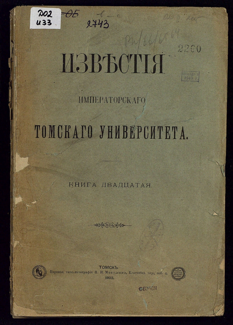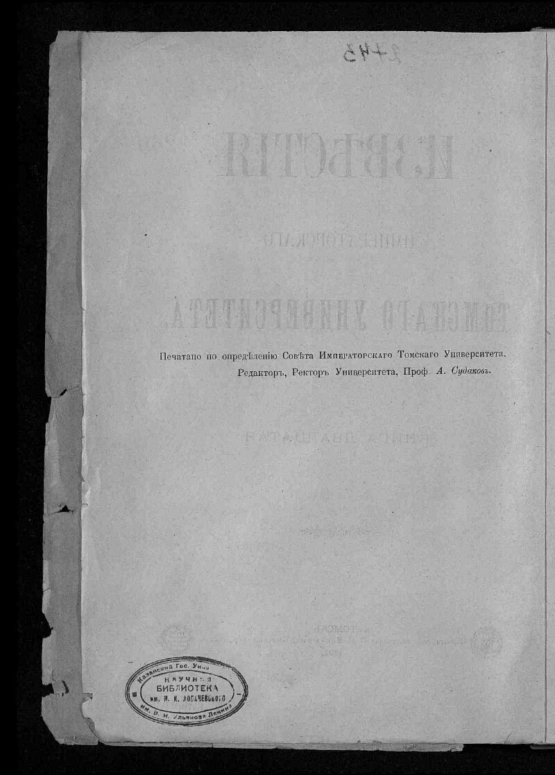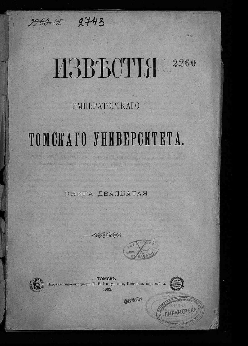 Известия Императорского Томского университета. - Кн. 1-70, Т. 71-. -Томск, 1889-1916. - Загл.: Кн. 1 (1889) - 65 (1916) Известия Императорского Томского университета (на тит. л. кн. 1 - 2: Томские университетские известия ; в Кн. 50 (1913) загл. отсутствует) ; Кн. 66 (1917) - 84 (1929) Известия Томского государственного университета; с Т. 85 (1932) Труды Томского государственного университета (с Т. 87 (1935) ... имени В. В. Куйбышева); Т. 98 (1947) Труды Томского государственного университета им. В. В. Куйбышева и Томского государственного педагогического института ; отд. вып. с 1948 по 1976 гг. вых. под загл.: Труды Томского ордена Трудового Красного Знамени государственного университета им. В. В. Куйбышева (т. 204 (1971) загл. отсутствует); с Т. 266 (1998) - Вестник Томского государственного университета. Редактором издания являлся действующий ректор Университета; отдельные тома разновременно подписывали: проф. А. И. Судаков (1901-1902); проф. М. Г. Курлов (1904-1905, 1907); проф. Ф. К. Крюгер (1908-1909); И. А. Базанов (1911-1912). Издатель: Совет Императорского Томского университета. Внутри выпусков пагинация смешанная, около 374—1574 стр.; содержит карты, таблицы, иллюстрации. В составе «Известий» кн. 21 печатались «Труды Юридического кабинета при Томском университете. Статистико-экономическое отделение», вып. 1. Вых. с 1889 г. В период 1889-1916 гг. вышло 65 томов, в 1917-1929 гг. вышли тома с 66 по 84, в 1932-1976 гг. вышли тома 85-265, в период с 1976 по 1998 гг. журнал не издавался, возобновлен в 1998 г. с тома 266. Содержание Кн. 1-9 1889-1896 в Кн. 10 1896. С. I-VIII.
