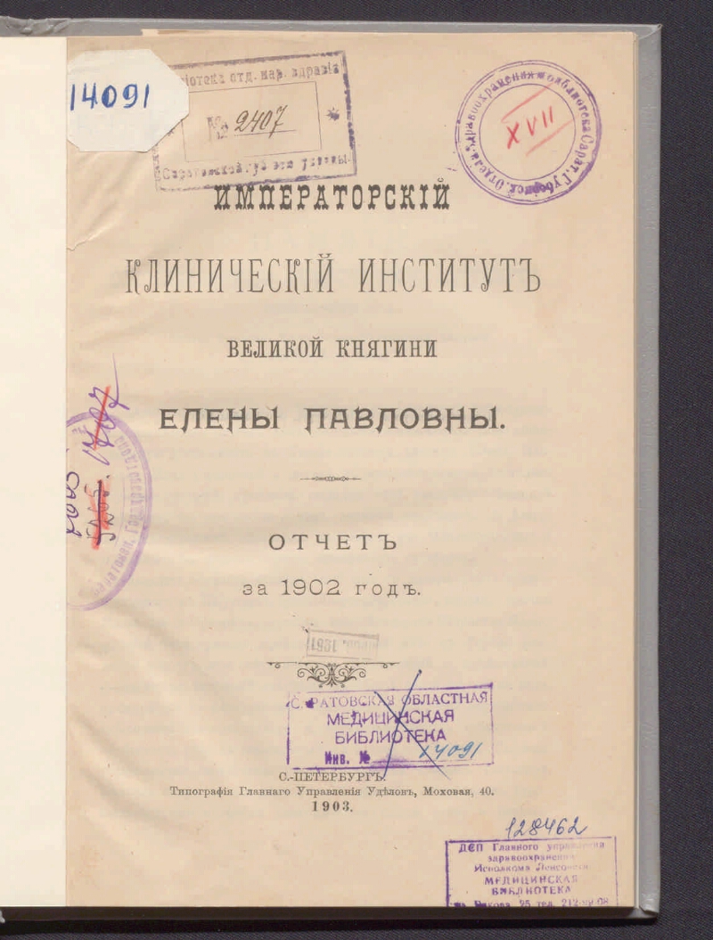 Императорский клинический институт Великой княгини Елены Павловны : отчет за 1902 год. - С.-Петербург : типография Главного Управления Уделов, 1903. - 121, [2] с. - Библиография в тексте.