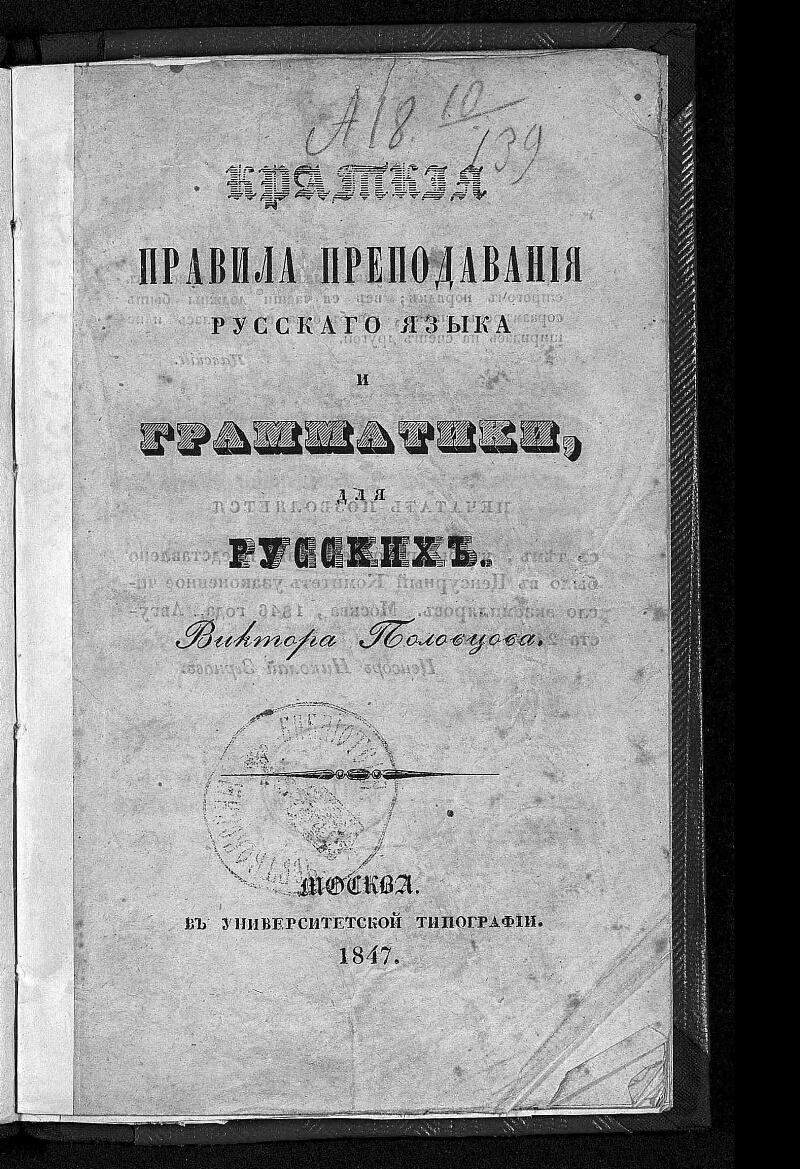 Краткие правила преподавания русского языка и грамматики, для русских / [cоч.] Виктора Половцова, [инспектора классов Михайловского Воронежского кадетского корпуса]. - Москва : в Университетской типографии, 1847. - 78, IV с. ; 19 см