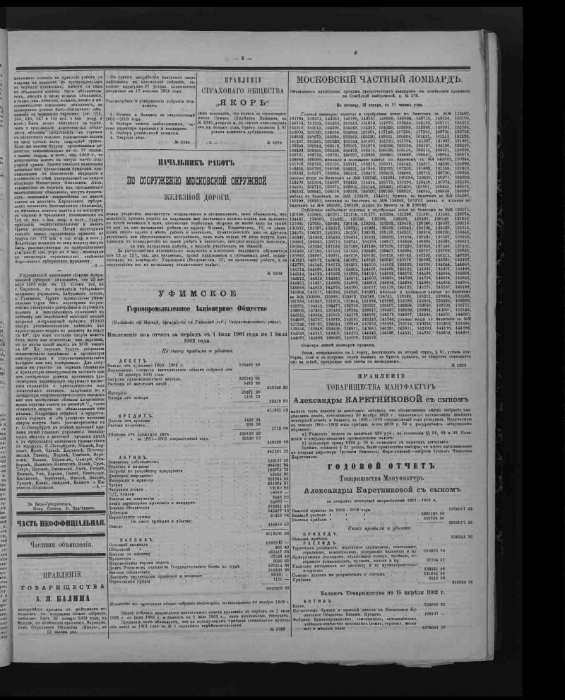 Московские губернские ведомости. - 1838, № 1 (4 января) - 1917, [?]. - Москва, 1838-1917. - С 1841 г. газета выходила в 2-х частях: официальная и неофициальная. С 1841 г. по 24 февраля 1845 г. неофициальная часть издавалась как прибавление к номеру. С 24 апреля 1865 г. по 29 января 1872 г. и с 6 января 1879 г. неофициальная часть издавалась совместно с официальной частью. В 1841-1917 гг. выходили приложения к отдельным номерам. Указатели: за 1842-1844, 1846-1848, 1850-1854 гг.. - С 3 июня 1917 г. неофициальная часть выходила под заглавием: Московские губернские ведомости (неофициальная часть). Известия Московского губернского избирательного комитета