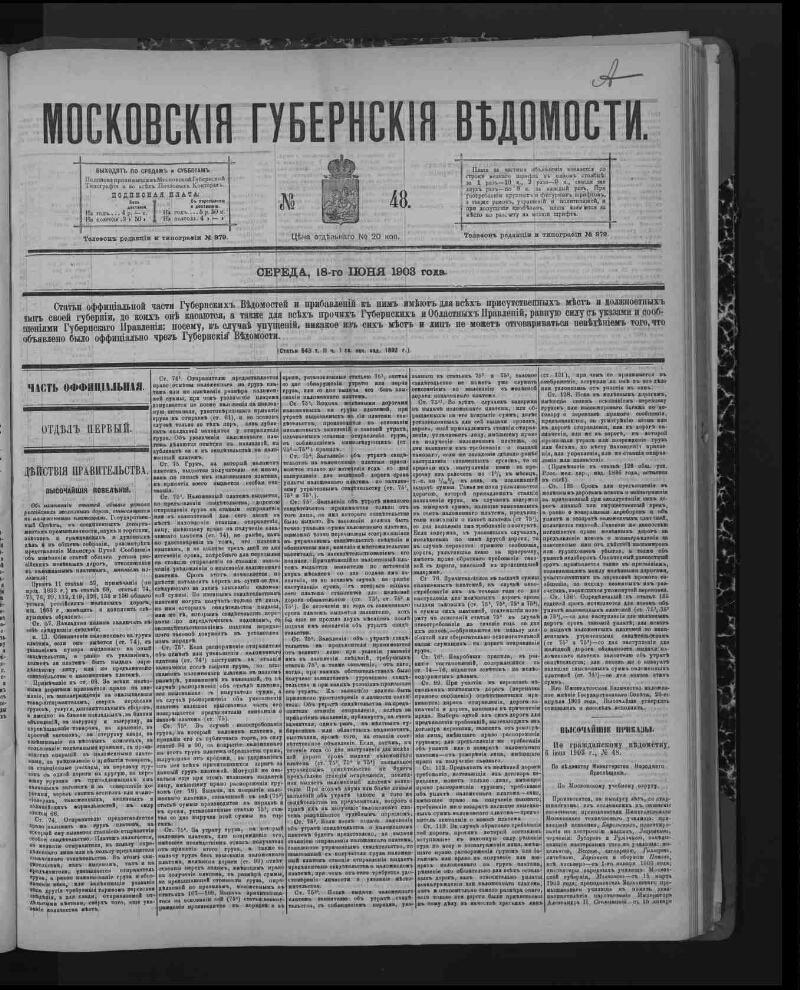 Московские губернские ведомости. - 1838, № 1 (4 января) - 1917, [?]. - Москва, 1838-1917. - С 1841 г. газета выходила в 2-х частях: официальная и неофициальная. С 1841 г. по 24 февраля 1845 г. неофициальная часть издавалась как прибавление к номеру. С 24 апреля 1865 г. по 29 января 1872 г. и с 6 января 1879 г. неофициальная часть издавалась совместно с официальной частью. В 1841-1917 гг. выходили приложения к отдельным номерам. Указатели: за 1842-1844, 1846-1848, 1850-1854 гг.. - С 3 июня 1917 г. неофициальная часть выходила под заглавием: Московские губернские ведомости (неофициальная часть). Известия Московского губернского избирательного комитета