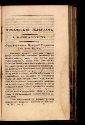 Московский телеграф : Журнал литературы, критики, наук и художеств, изд. Николаем Полевым. - Москва, 1830. - Подзаг.: Ч. 1 - 6 (1825) Журнал литературы, критики, наук и художеств, изд. Николаем Полевым; Ч. 7 (1825) - 56 (1834) Изд. Николаем Полевым.