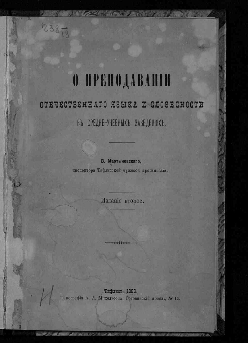 О преподавании отечественного языка и словесности в среднеучебных заведениях / [Соч.] В. Мартыновского, инспектора Тифлис. муж. прогимназии. - 2-е изд. - Тифлис : тип. А.А. Михельсона, 1888. - [2], 37 с. ; 24. - В 1-м изд. загл.: К вопросу о преподавании отечественного языка и словесности в средних учебных заведениях. Без тит. л.