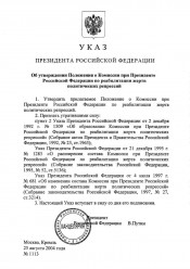 Об утверждении Положения о Комиссии при Президенте Российской Федерации по реабилитации жертв политических репрессий : Указ Президента Российской Федерации от 25 августа 2004 № 1113. - Москва, 2004. - 1, 2 листа. - В конце текста подпись: Президент Российской Федерации В. Путин. Место и дата подписания: Москва, Кремль 25 августа 2004 года. Электронная версия правого акта (3 файла, 300 dpi, JPEG, 3,8 МБ). К Указу прилагается: Положение о Комиссии при Президенте Российской Федерации по реабилитации жертв политических репрессий : утверждено Указом Президента Российской Федерации от 25 августа 2004 г. № 1113. - Опубликован в издании: Собрание законодательства Российской Федерации от 2004 г., № 35, ст. 3613