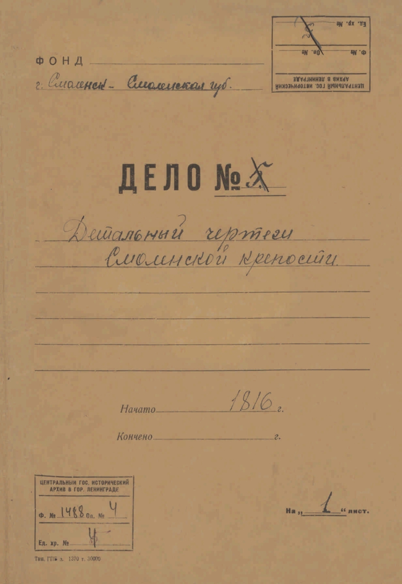 Смоленская крепость. План, фасад стен, разрезы башен. Часть 2-я. 1816 г. [Дело]. - 1816. - 1 лист. - (Фонд Планы и чертежи гражданской архитектуры (коллекция). Опись № 4). - Рукописный текст. Бумага. Чернила, тушь, акварель. На обложке название фонда и описи: г. Смоленск - Смоленская губ. Оригинальный заголовок дела: Детальный чертеж Смоленской крепости. 1816. В деле содержатся план: Детальный чертеж Смоленской крепости
