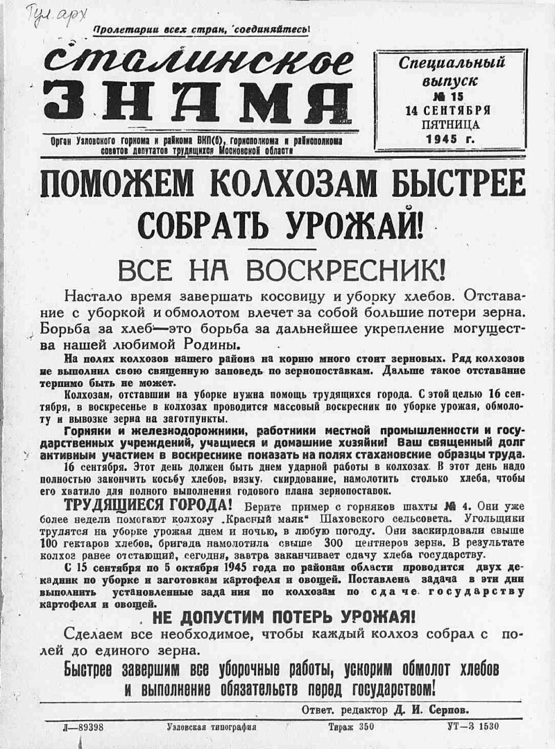 Сталинское знамя : орган Узловского РК ВКП(б) и районного Совета депутатов трудящихся Тульской области. - Узловая , [1930-1945]