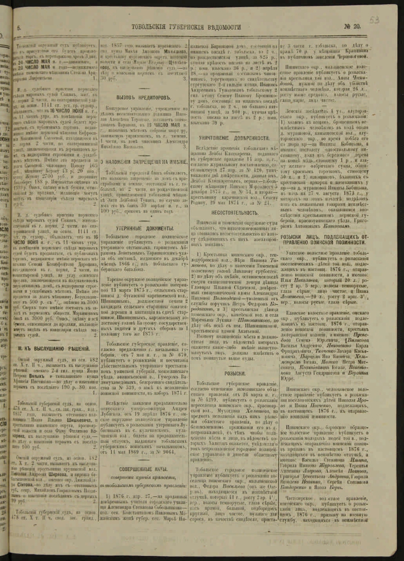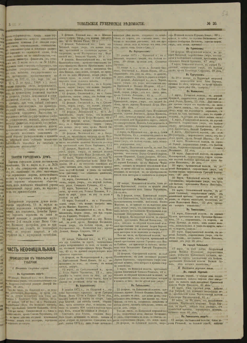 Тобольские губернские ведомости. - 1857, 27 апр. - 1918, 3 апр. - Тобольск, 1857-1918. - Выходили в 2 ч.: офиц. и неофиц.; с 1893 по 1897 обе части изд. раздельно. Прил.: Ежегодник Тобольского губернского музея. Вып. 7-8. 1896-1897 ; Рукописи библиотеки Тобольского губернского музея за XVII и первую четверть XVIII столетия. 1645-1676. (Вып. 2-й). 1896 ; Отдел сельского хозяйства и кустарной промышленности. 1896-1906 ; Школьный отдел при неофициальной части "Тобольских губернских ведомостей". 1907-1917 ; Прил. к отд. номерам. Указ.: за 1858-1867, 1893.