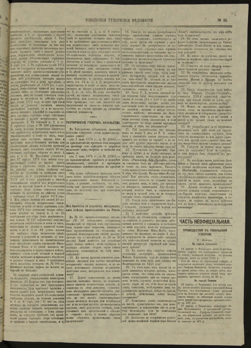 Тобольские губернские ведомости. - 1857, 27 апр. - 1918, 3 апр. - Тобольск, 1857-1918. - Выходили в 2 ч.: офиц. и неофиц.; с 1893 по 1897 обе части изд. раздельно. Прил.: Ежегодник Тобольского губернского музея. Вып. 7-8. 1896-1897 ; Рукописи библиотеки Тобольского губернского музея за XVII и первую четверть XVIII столетия. 1645-1676. (Вып. 2-й). 1896 ; Отдел сельского хозяйства и кустарной промышленности. 1896-1906 ; Школьный отдел при неофициальной части "Тобольских губернских ведомостей". 1907-1917 ; Прил. к отд. номерам. Указ.: за 1858-1867, 1893.