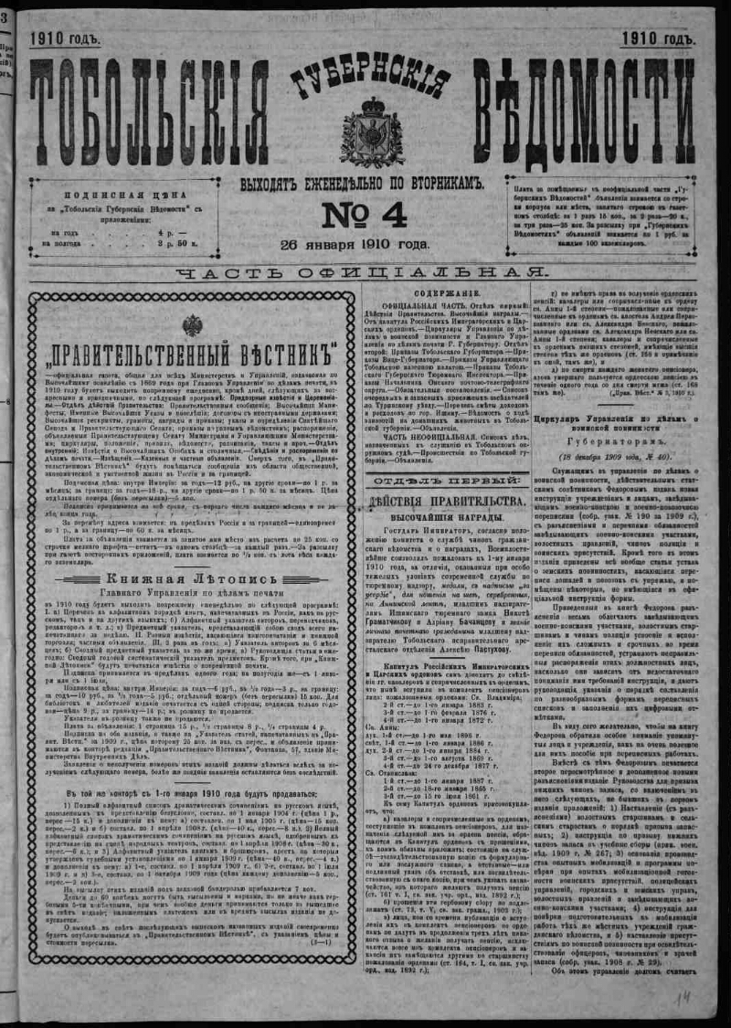 Тобольские губернские ведомости. - 1857, 27 апр. - 1918, 3 апр. - Тобольск, 1857-1918. - Выходили в 2 ч.: офиц. и неофиц.; с 1893 по 1897 обе части изд. раздельно. Прил.: Ежегодник Тобольского губернского музея. Вып. 7-8. 1896-1897 ; Рукописи библиотеки Тобольского губернского музея за XVII и первую четверть XVIII столетия. 1645-1676. (Вып. 2-й). 1896 ; Отдел сельского хозяйства и кустарной промышленности. 1896-1906 ; Школьный отдел при неофициальной части "Тобольских губернских ведомостей". 1907-1917 ; Прил. к отд. номерам. Указ.: за 1858-1867, 1893.