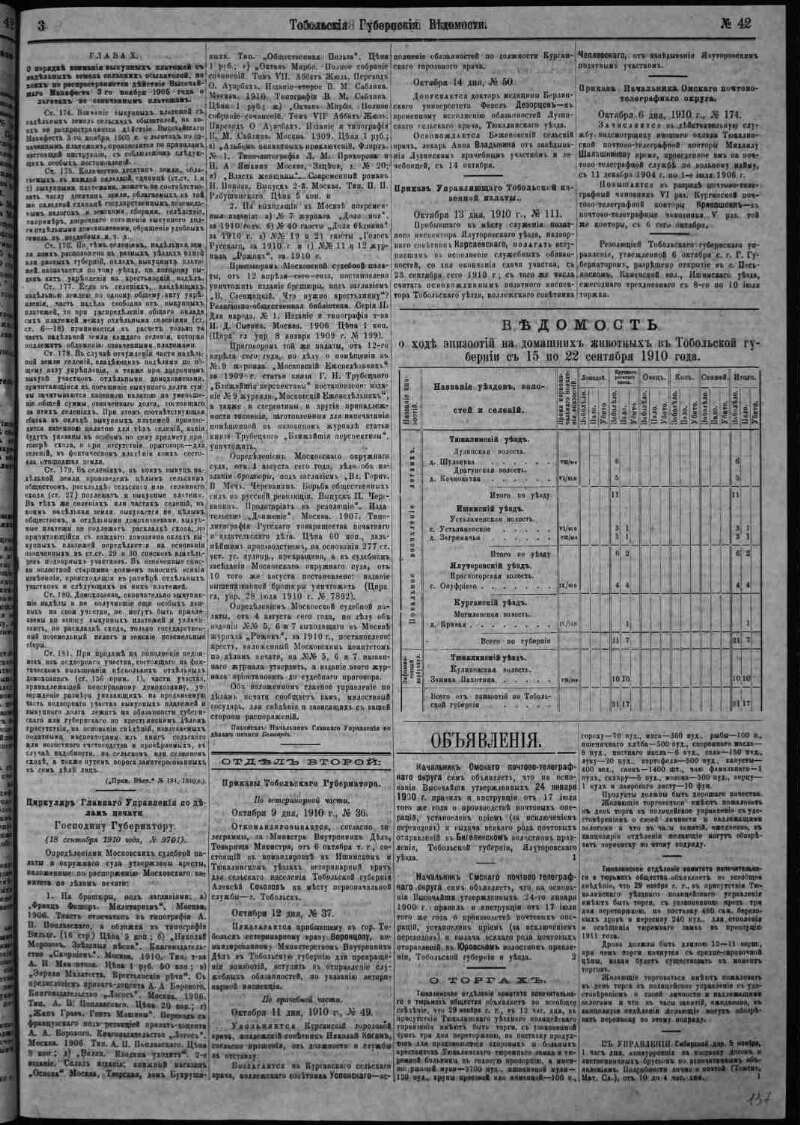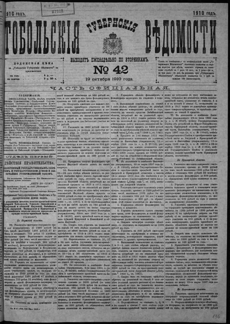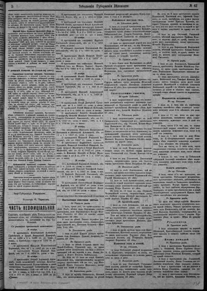 Тобольские губернские ведомости. - 1857, 27 апр. - 1918, 3 апр. - Тобольск, 1857-1918. - Выходили в 2 ч.: офиц. и неофиц.; с 1893 по 1897 обе части изд. раздельно. Прил.: Ежегодник Тобольского губернского музея. Вып. 7-8. 1896-1897 ; Рукописи библиотеки Тобольского губернского музея за XVII и первую четверть XVIII столетия. 1645-1676. (Вып. 2-й). 1896 ; Отдел сельского хозяйства и кустарной промышленности. 1896-1906 ; Школьный отдел при неофициальной части "Тобольских губернских ведомостей". 1907-1917 ; Прил. к отд. номерам. Указ.: за 1858-1867, 1893.