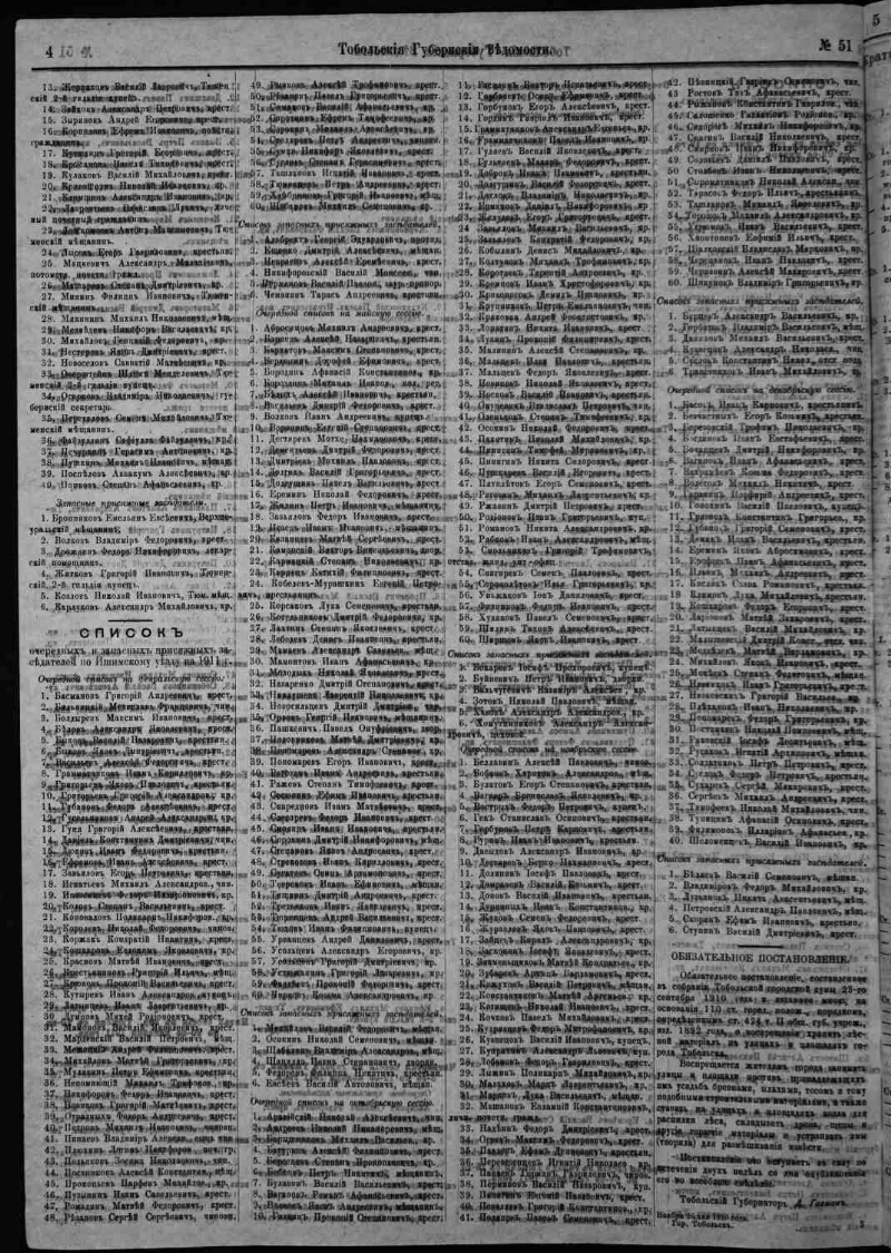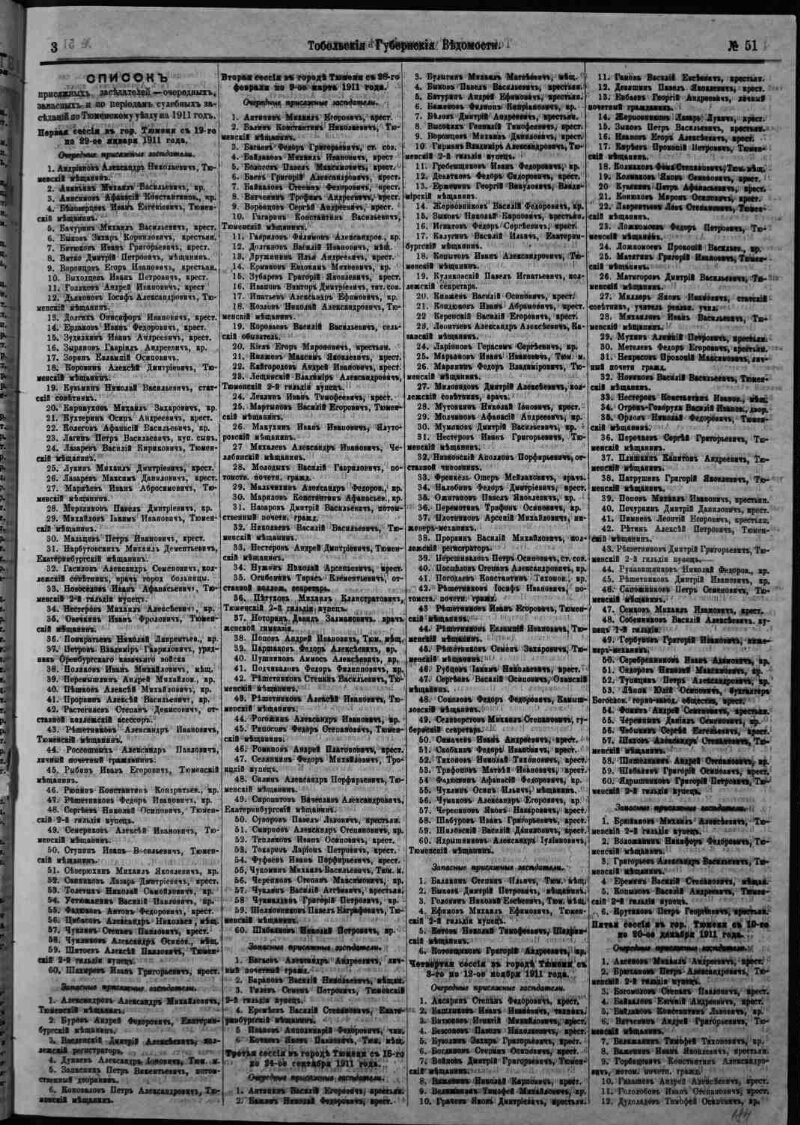 1910, № 51 (21 дек.). - 1910. - 8 с. - Содерж.: Список присяжных заседателей - очередных, запасных и по периодам судебных заседаний по Тюменскому уезду на 1911 год.