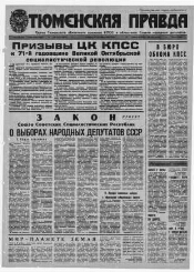 Тюменская правда : орган Тюменского областного и городского комитетов ВКП(б), областного и городского Совета депутатов трудящихся. - Тюмень, 1944-. - До 1 октября 1944 г. выходила под заглавием "Красное знамя". Подзаг.: 1944 - 12 октября 1952 – орган Тюменского областного и городского комитетов ВКП(б), областного и городского Советов депутатов трудящихся ; 15 октября 1952 - 15 января 1963 – орган Тюменского областного и городского комитетов КПСС, областного и городского Советов депутатов трудящихся ; 16 января 1963 - 25 декабря 1964 – орган Тюменских промышленного и сельского обкомов КПСС, областных промышленного и сельского Советов депутатов трудящихся ; 26 декабря 1964 г. – орган Тюменского обкома КПСС, областных сельского и промышленного Советов депутатов трудящихся ; 27 декабря 1964 - 1990 – орган Тюменского областного комитета КПСС и областного Совета депутатов трудящихся ; с 1990 по настоящее время – общественно-политическая газета. Издается с 1923 г.