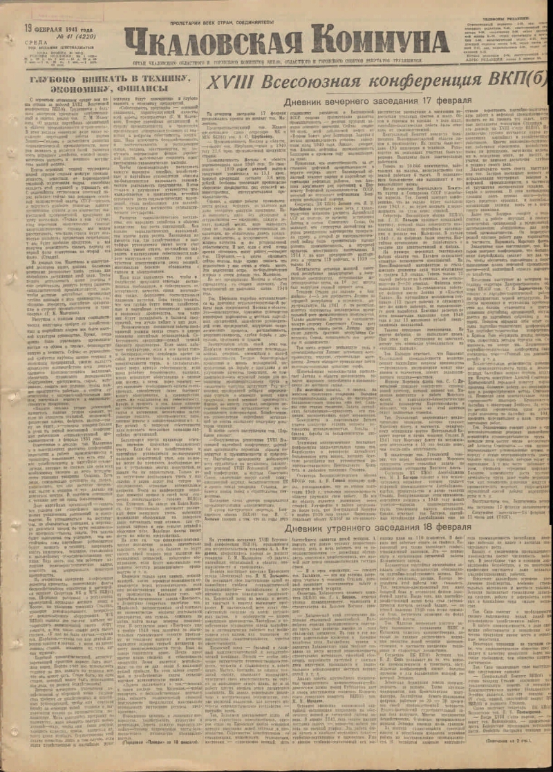 Чкаловская Коммуна : орган Чкаловского областного и городского комитетов ВКП(б), областного и городского Советов депутатов трудящихся. - Чкаловск , 1939-1958