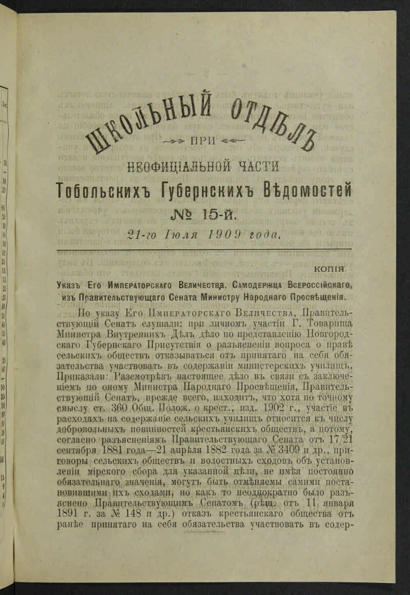 Школьный отдел при неофициальной части "Тобольских губернских ведомостей". - 1907, № 1 (3 сентября) - 1917, № 15 (12 декабря). - Тобольск, 1907, 3 сентября - 1917, [декабрь]. - Выходит как отдельное приложение к неофициальной части "Тобольских губернских ведомостей".