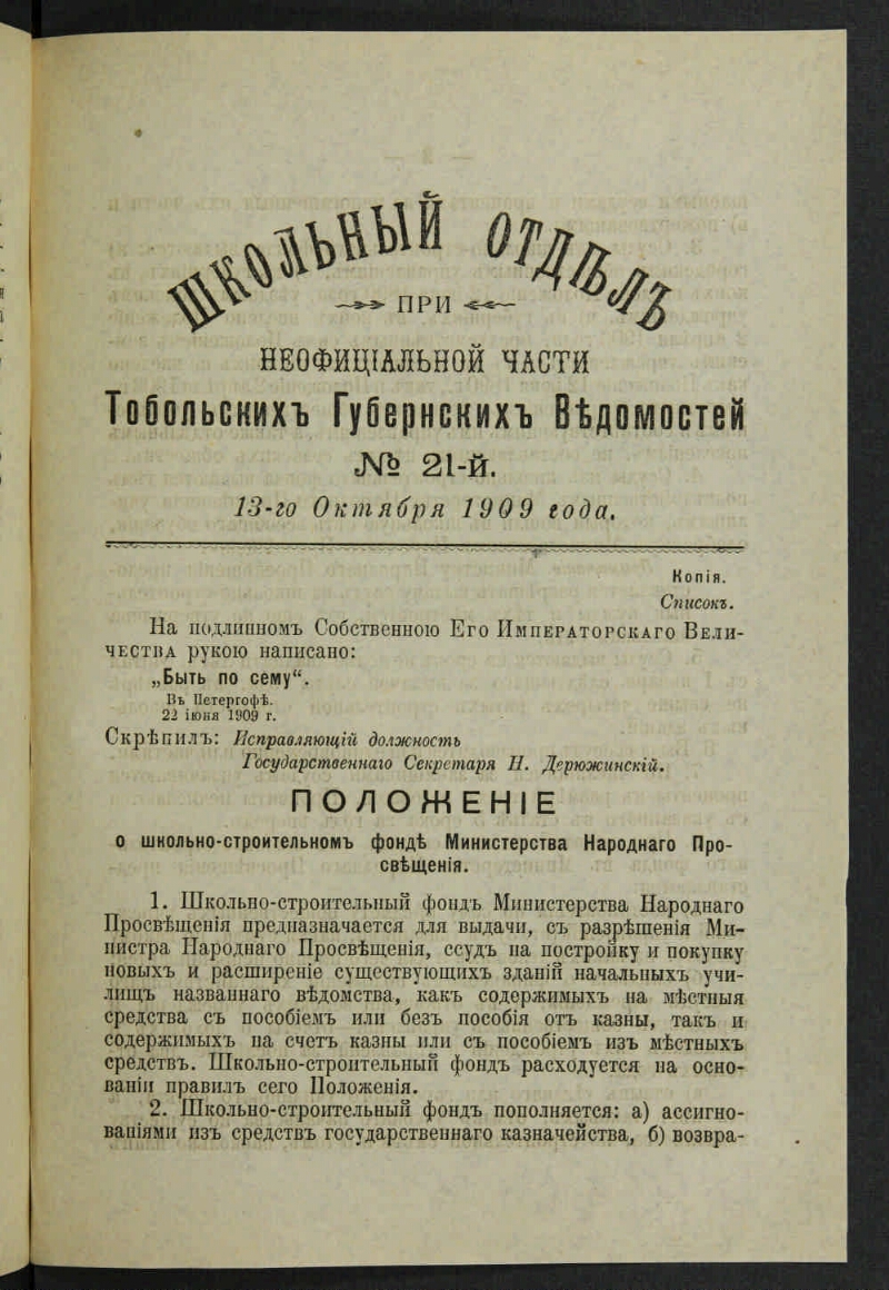 Школьный отдел при неофициальной части "Тобольских губернских ведомостей". - 1907, № 1 (3 сентября) - 1917, № 15 (12 декабря). - Тобольск, 1907, 3 сентября - 1917, [декабрь]. - Выходит как отдельное приложение к неофициальной части "Тобольских губернских ведомостей".