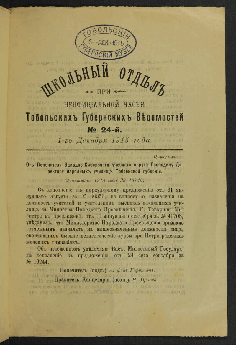 Школьный отдел при неофициальной части "Тобольских губернских ведомостей". - 1907, № 1 (3 сентября) - 1917, № 15 (12 декабря). - Тобольск, 1907, 3 сентября - 1917, [декабрь]. - Выходит как отдельное приложение к неофициальной части "Тобольских губернских ведомостей".