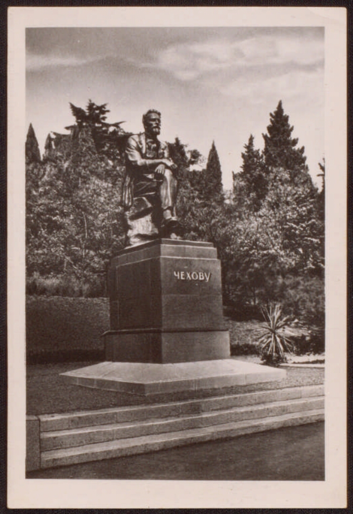 Ялта. Приморский парк. Памятник А. П. Чехову [Изоматериал : электронный ресурс] : [открытка] / фото Т. Бакмана. - Электронные данные (2 файла : 2,6 МБ). -(Санкт-Петербург: Президентская библиотека имени Б. Н. Ельцина , 2014). - Режим доступа: интернет-портал Президентской библиотеки имени Б. Н. Ельцина. Заглавие с экрана. Электронная репродукция почтовой открытки: Ялта. Приморский парк. Памятник А. П. Чехову [Изоматериал] / фото Т. Бакмана. Киев : Фабрика массовой фотопечати треста "Укрфото", 1956. 1 открытка : офсет. (Крым / редактор А. Погорелов). БФ 03756. № 1082. 65 коп. Тираж 10 т. Местонахождение: Детский музей открытки, Санкт-Петербург. Копирование пользователями не разрешается. На открытке фотография памятника Антону Павловичу Чехову в Ялте. 15 июля 1953 года, в 49-ю годовщину со дня смерти писателя, в центре главной аллеи Приморского парка был открыт памятник Антону Павловичу Чехову. В открытии приняли участие и выступили с речами сестра писателя — М. П. Чехова и его жена — О. Л. Книппер-Чехова. - Использованы материалы сайта "Ялта путеводитель" (http://jalita.com/guidebook/street/monument_chekhov.shtml)