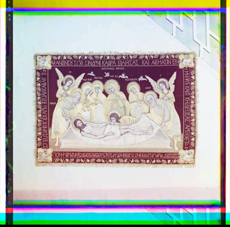 Plashchanitsa, podarennaia Imperatorom Aleksandrom I. Vyshita grechankami. [Goritskii monastyr', Rossiiskaia imperiia] [graphic] . - [1909]. - 1 negative (3 frames) : glass, b&w, three-color separation ; 24x9