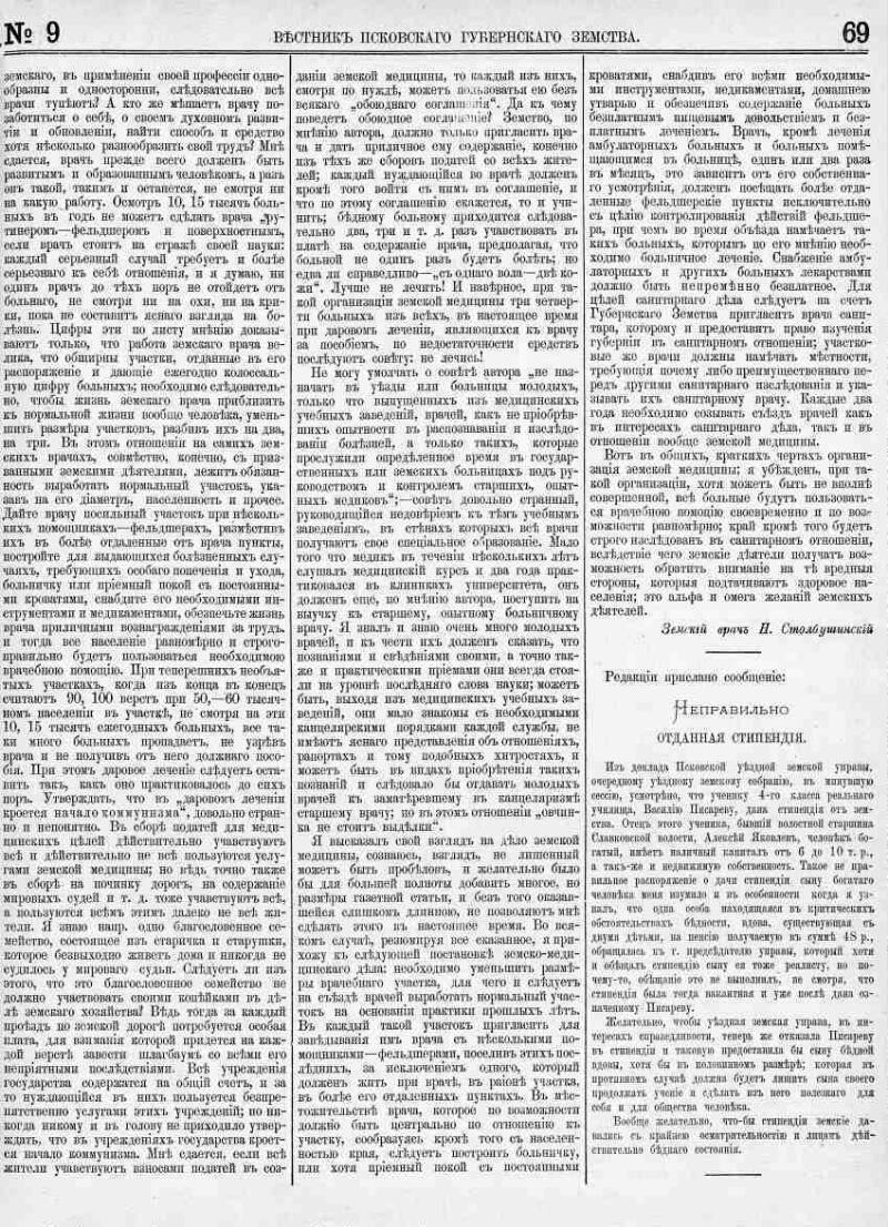 Вестник Псковского губернского земства : еженедельное издание. - 1880, № 1 - 1914, № 14. - Псков ; 1880-1914. - Заглавие: 1880-1914, № 13 Вестник Псковского губернского земства ; 1914, № 14 - 1917, № 4 Вестник Псковского губернского земства и сельского хозяйства Псковской губернии ; 1917, № 1 (июль) Вестник Псковского губернского земства и Губернского продовольственного комитета. Подзаг.: 1880-1886, 1906-1914 Еженедельное издание. Издательство: 1880-1886, 1906-1914 Издание Псковского губерского земства ; 1887-1905 Издание Псковской губернской земской управы. В 1901-1911 гг. публиковались приложения: Журнал и постановления губернских и уездных земских собраний. В 1903-1905 гг. на страницах журнала печаталась "Ветеринарная хроника Псковской губернии", выходившая также отдельно. - Взамен №№ 25-26 (1907) вышла брошюра: "Новый избирательный закон". [Псков, 1907].