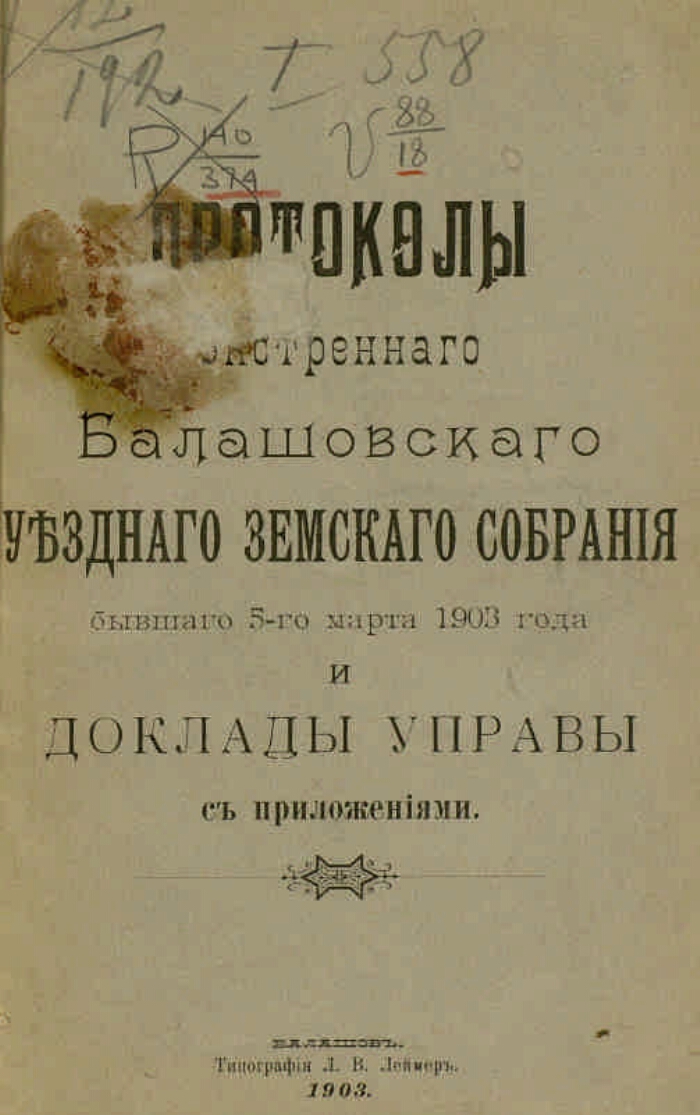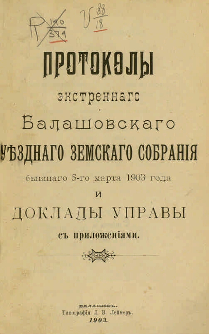 Журналы заседаний ... Балашовского уездного земского собрания ... : с предположениями уездной управы. - Саратов : Тип. Кувардина, 1868-1915. - 22-29 см. - Место изд. ряда журн.: Балашов. Загл. журн. за 1876-1877, 1879 гг. - Протоколы ... Балашовского уездного земского собрания; за 1884 чрезв., 1902 экстр., 1903 экстр. гг. - Протоколы ... Балашовского уездного земского собрания и доклады Управы; за 1899 г. - Протоколы ... Балашовского уездного земского собрания, смета, раскладка земских соборов и доклады Управы; за 1866-1867, 1880-1886, 1888-1891, 1895-1898, 1900-1901, 1903-1904, 1906-1911, 1915 гг. незнач. изм.: Журнал ... Балашовского уездного земского собрания ... с докладами Управы.