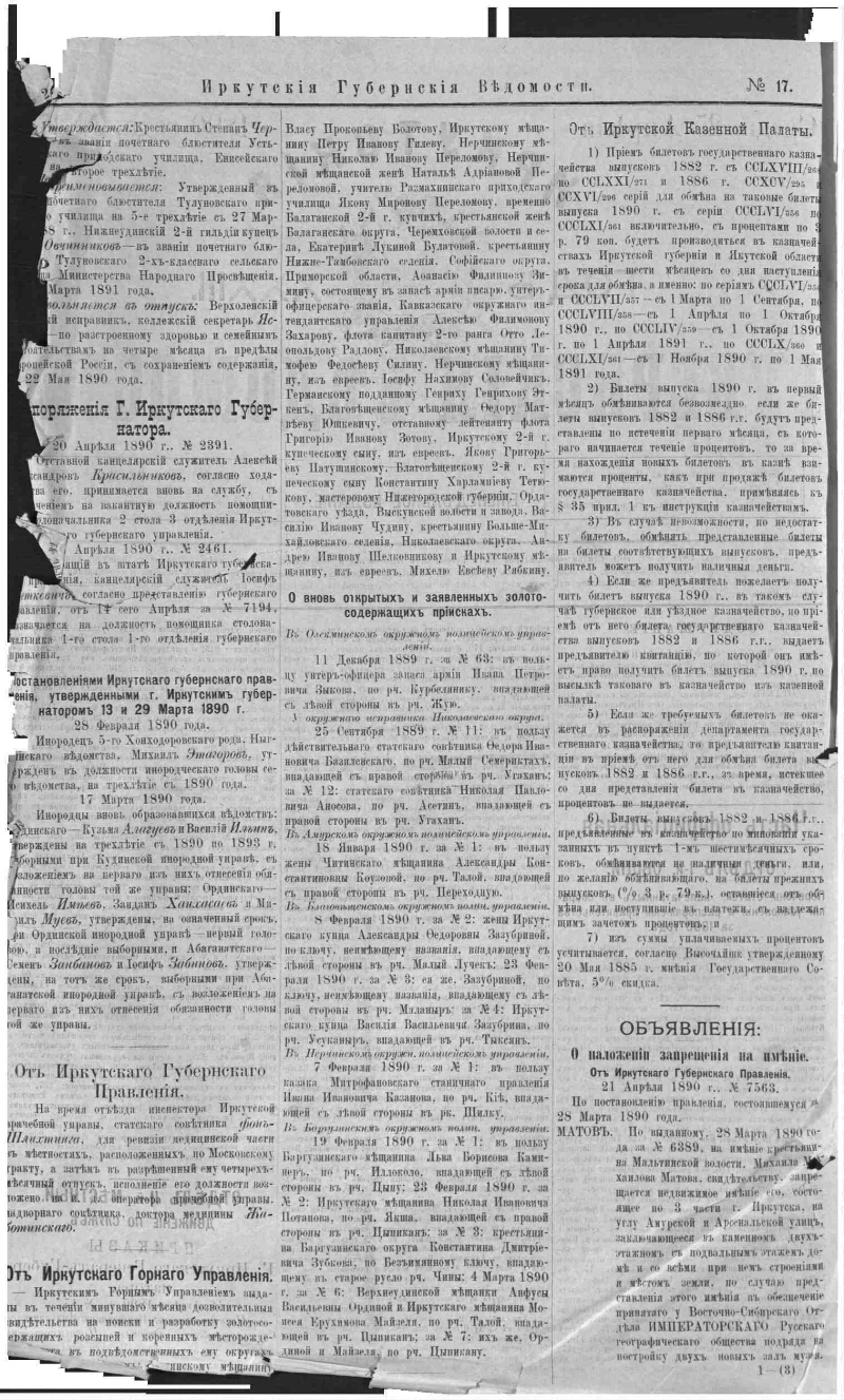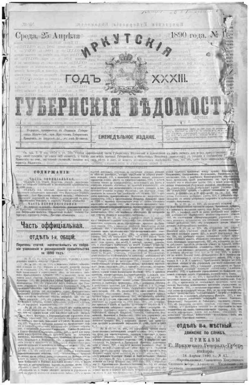Описание Иркутские губернские ведомости . - Иркутск : Иркутское губернское правление , 1857- 1890, № 17 (25 апр.). - 8, 2, 2 с. - Содерж. прил. к офиц. части . 1. История -- Периодические издания -- Россия. 2. Иркутская губерния. ББК 63.3(28-8Ирк)522я51 Источник электронной копии: Иркутская ОГУНБМесто хранения оригинала: Иркутская ОГУНБ Издательство Иркутское губернское правление Объект в каталогах История В коллекциях Отечественная периодика в фонде Президентской библиотеки → Газеты → И → Иркутские губернские ведомости. Иркутск. → 1890