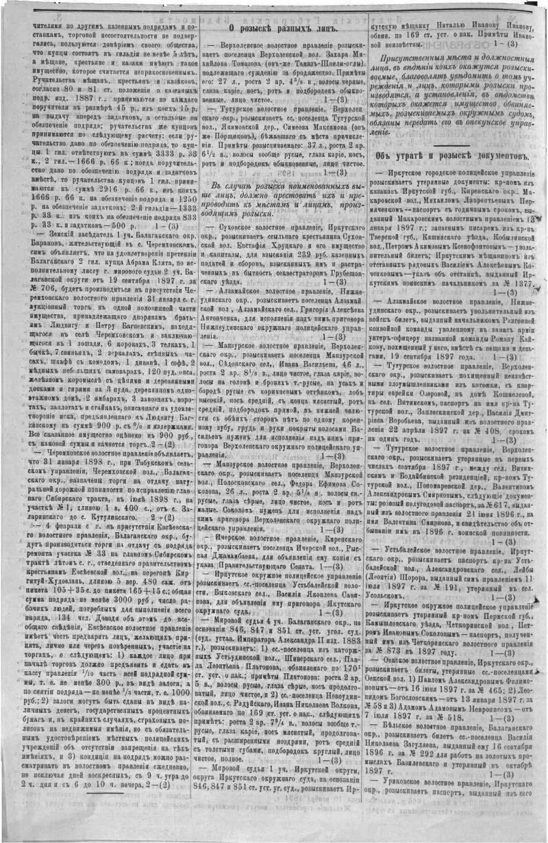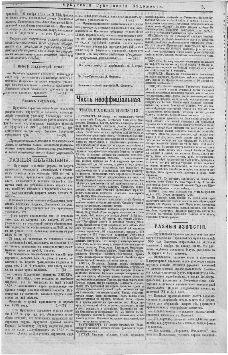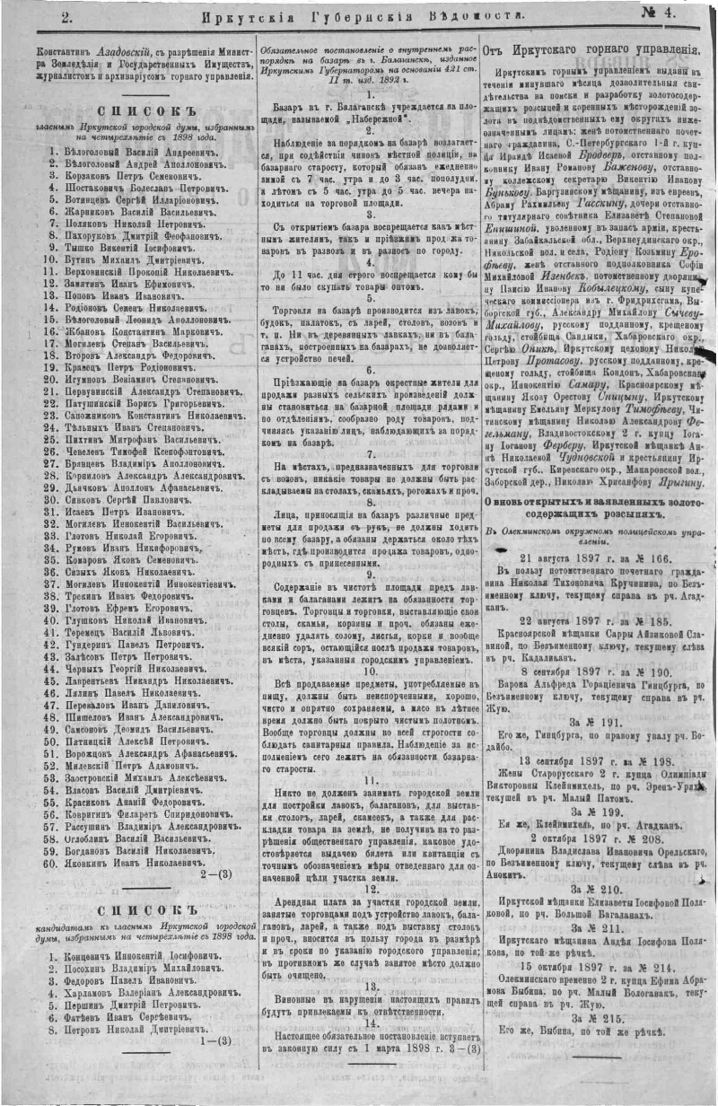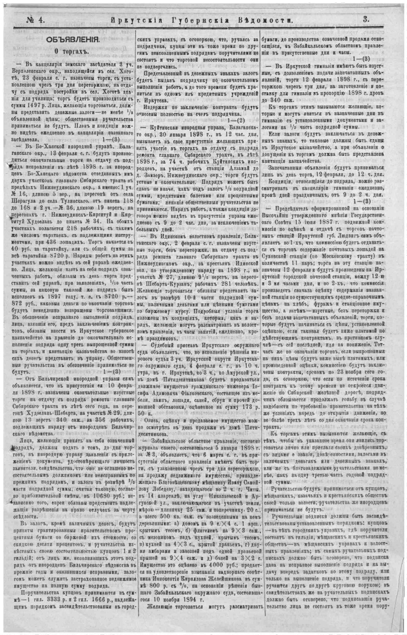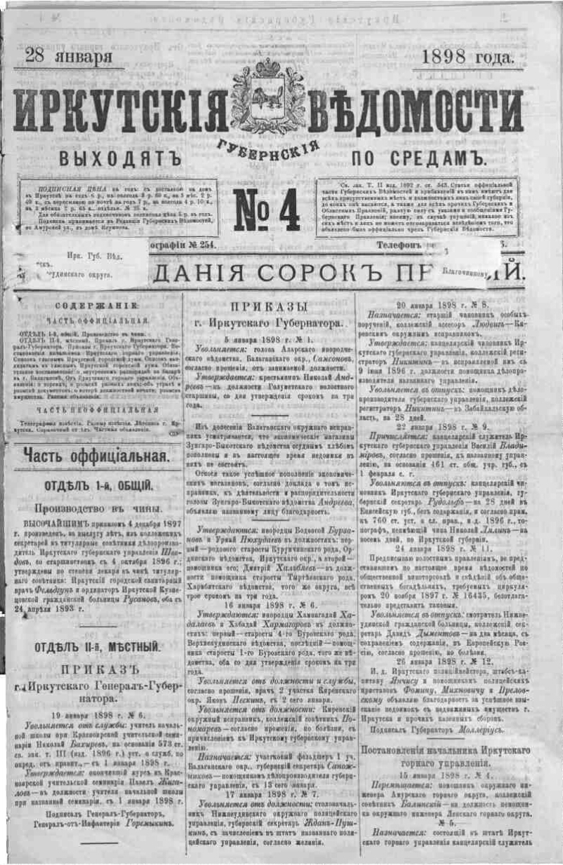 1898, № 4 (28 янв.). - 14, [2] с. - Содерж.: Прибавление к № 4 официальной части Иркутск. Губернск. ведомостей за 1898 год