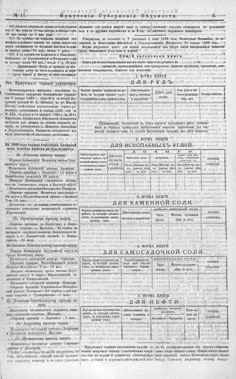 1899, № 11 (17 марта). - 10, [2] с. - Содерж.: Ведомость о ценах, установленных на хлеб, фураж и проч. по Иркутской губернии по 4 уездам: Иркутскому, Нижнеудинскому, Балаганскому и Верхоленскому на март месяц 1899 г.; Ведомость о ценах, установленных на сухопутную перевозку тяжестей и водяные сплавы по Иркутской губернии на март месяц 1899 г.