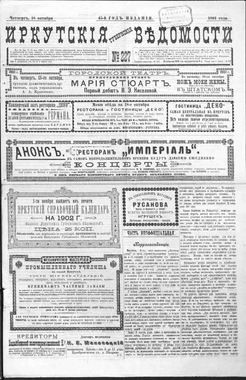 Иркутские губернские ведомости. 1901, № 227 (18 окт.)