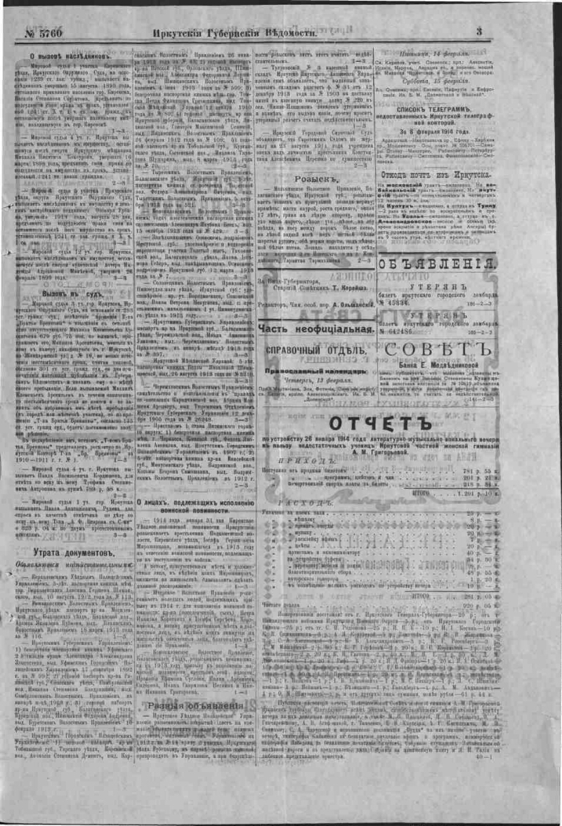 Описание Иркутские губернские ведомости . - Иркутск : Иркутское губернское правление , 1857- 1914, № 5760 (13 февр.). - 4 с. . 1. История -- Периодические издания -- Россия. 2. Иркутская губерния. ББК 63.3(28-8Ирк)534я51 Источник электронной копии: Иркутская ОГУНБМесто хранения оригинала: Иркутская ОГУНБ Издательство Иркутское губернское правление Объект в каталогах История В коллекциях Отечественная периодика в фонде Президентской библиотеки → Газеты → И → Иркутские губернские ведомости. Иркутск. → 1914