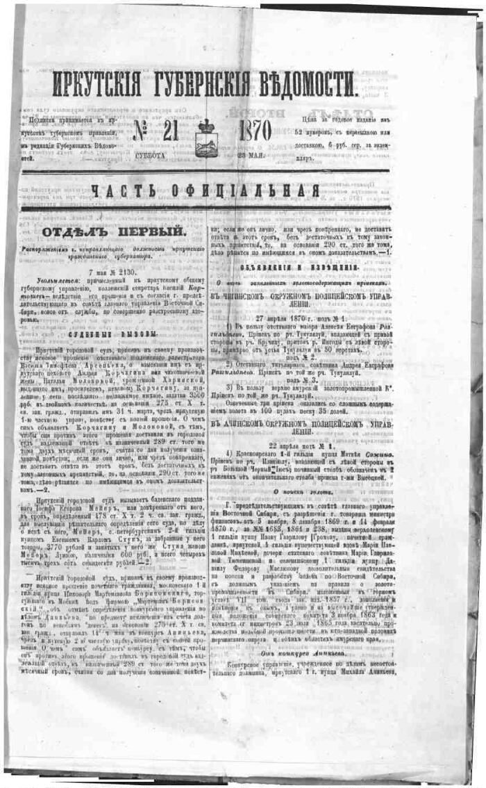 Описание Иркутские губернские ведомости . - Иркутск : Иркутское губернское правление , 1857- 1870, № 21. - 8 с. - С. 3-4 следуют после с. 8 . 1. История - Периодические издания - Россия ББК 63.3(28-8Ирк)522я51 Источник копии: Иркутская ОГУНБМесто хранения оригинала: Иркутская ОГУНБ Издательство Иркутское губернское правление Объект в каталогах История В коллекциях Отечественная периодика в фонде Президентской библиотеки → Газеты → И → Иркутские губернские ведомости. Иркутск. → 1870