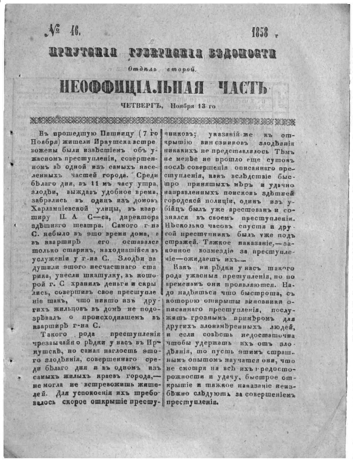 Описание Иркутские губернские ведомости . - Иркутск : Иркутское губернское правление , 1857- 1858, № 46. - 16 с. - Неофициальная часть . 1. История - Периодические издания - Россия ББК 63.3(28-8Ирк)522я51 Источник копии: Иркутская ОГУНБМесто хранения оригинала: Иркутская ОГУНБ Издательство Иркутское губернское правление Объект в каталогах История В коллекциях Отечественная периодика в фонде Президентской библиотеки → Газеты → И → Иркутские губернские ведомости. Иркутск. → 1858