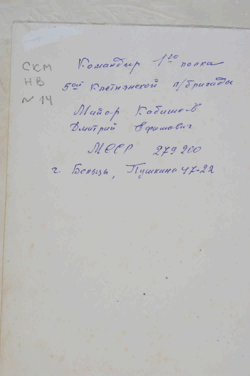 Кабышев Дмитрий Ефимович [Изоматериал : электронный ресурс] : [фотография] : из собрания Суражского краеведческого музея. - Электронная репродукция (2 файла, 300 dpi, JPEG, 4,2 МБ). - [Между 1940 и 1945]. - Фотопечать, черно-белая. - Режим доступа: интернет-портал Президентской библиотеки имени Б. Н. Ельцина. Заглавие из сопроводительного документа. Цифровая съемка фотографии произведена Т. И. Дьяконовой, Президентская библиотека. На оборотной стороне надпись чернилами: Командир 1-го полка 5-й Клетнянской п/бригады майор Кабышев Дмитрий Ефимович. Копирование пользователями не разрешается.