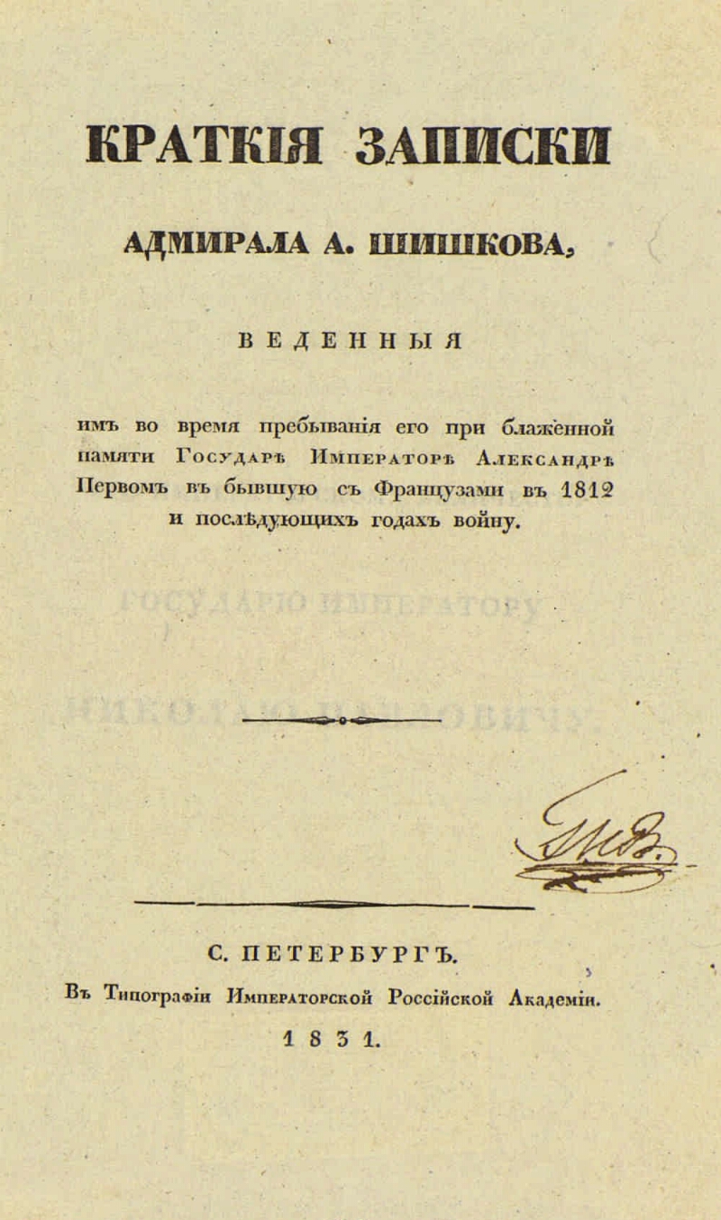 Краткие записки адмирала А. Шишкова, веденные им во время пребывания его при блаженной памяти государе императоре Александре Первом в бывшую с французами в 1812 и последующих годах войну. - С.-Петербург : тип. Имп. Рос. акад., 1831. - [10], 301 с. ; 23 см