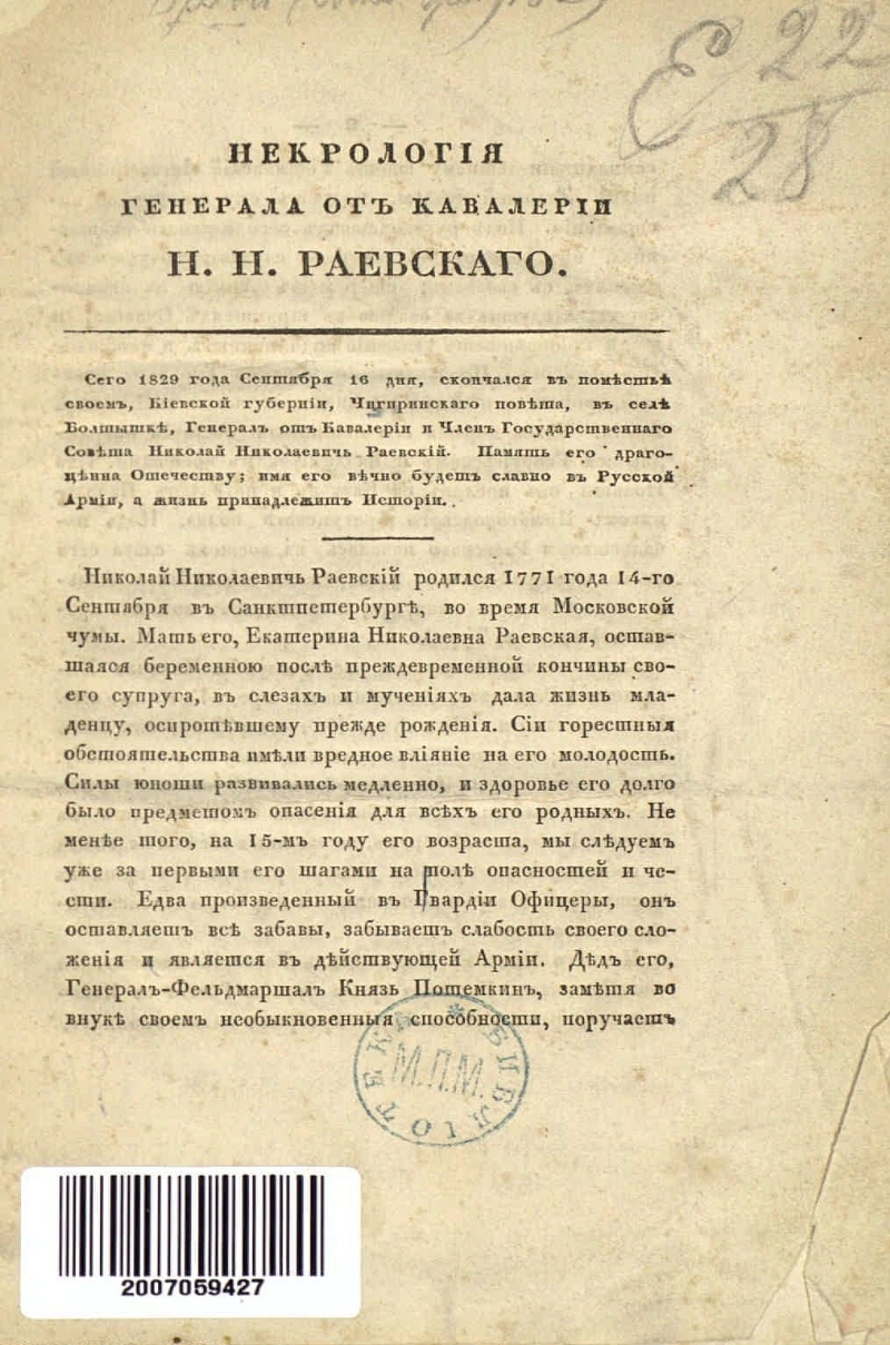Некрология генерала от кавалерии Н. Н. Раевского .- [С.-Петербург : В Воен. тип. , ценз. 1829] .- 12 с. ; 21 см .- Авт. установлен по изд.: Ченцов. Восстание декабристов. № 2598 Без тит. л. и обл.