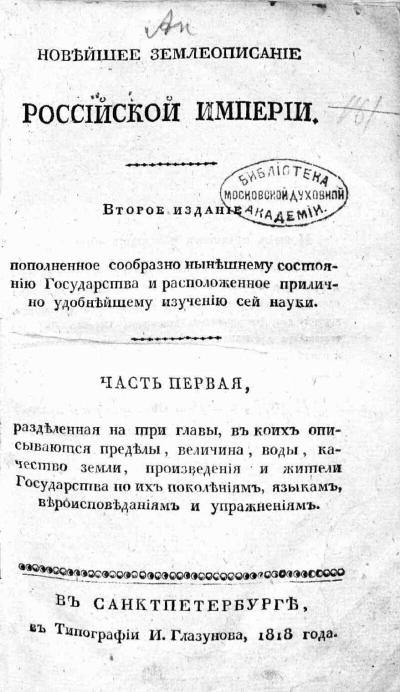 Новейшее землеописание Российской империи. - Второе издание : Пополненное сообразно нынешнему состоянию государства и расположенное прилично удобнейшему изучению сей науки. - В Санктпетербурге : В типографии И. Глазунова, 1818. - VI, 324, [5], 365 с., 20 см ; 8°. - Ценз.: И.О. Тимковский, 13 нояб. 1817 г., 12 окт. 1817 г. - Изд. И.П., И.И. и М.П. Глазуновы. - Имеется первоначальный вар. с. 87 - 88 ч. 1 со сведениями о населении России на 1805 г. (вар. 1). Вар. 2 учитывает данные 1811 - 1812 и 1813 г. - Фронт. изображение герба Российской империи. Ил. с изображениями гербов и мундиров губерний Российской империи. - Резц. грав. - Для подготовки 2-го издания Министерство народного просвещения разослало попечителям учебных округов специальный циркуляр, "которым предписывало озаботиться, чтобы... учителя уездных училищ проверили в непродолжительном времени страницы книги Зябловскаго, касающиеся их уезда, исправили, в случае нужды, и дополнили их.". - Сводный каталог русской книги 1801-1825 гг.