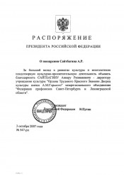 О поощрении Сайтбагина А. Р. : Распоряжение Президента Российской Федерации от 3 октября 2007 года № 547-рп. - Москва, 2007. - 1 л. - Электронная копия