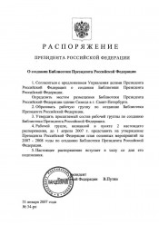 О создании Библиотеки Президента Российской Федерации : Распоряжение Президента Российской Федерации от 31 января 2007 года № 34-рп. - Москва, 2007. -3 л.. - Состав рабочей группы по подготовке и созданию Библиотеки Президента Российской Федерации (л. 2-3). Электронная копия.