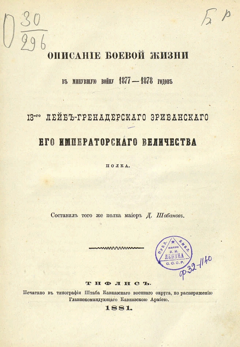 Описание боевой жизни в минувшую войну 1877-1878 годов 13-го Лейб-гренадерского Эриванского его императорского величества полка / Составил того же Полка майор Д. Шабанов ; [Под ред. артиллерии ген.-майора Чернявского]. - Тифлис : тип. Штаба Кавк. воен. окр., 1881. -201 с., 4 л. карт. ; 24 см. -