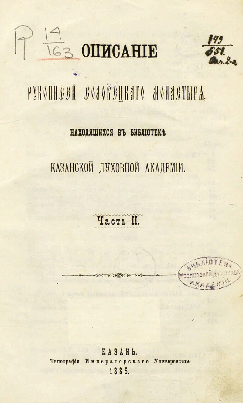 Описание рукописей Соловецкого монастыря, находящихся в Библиотеке Казанской духовной академии : Ч. 1-