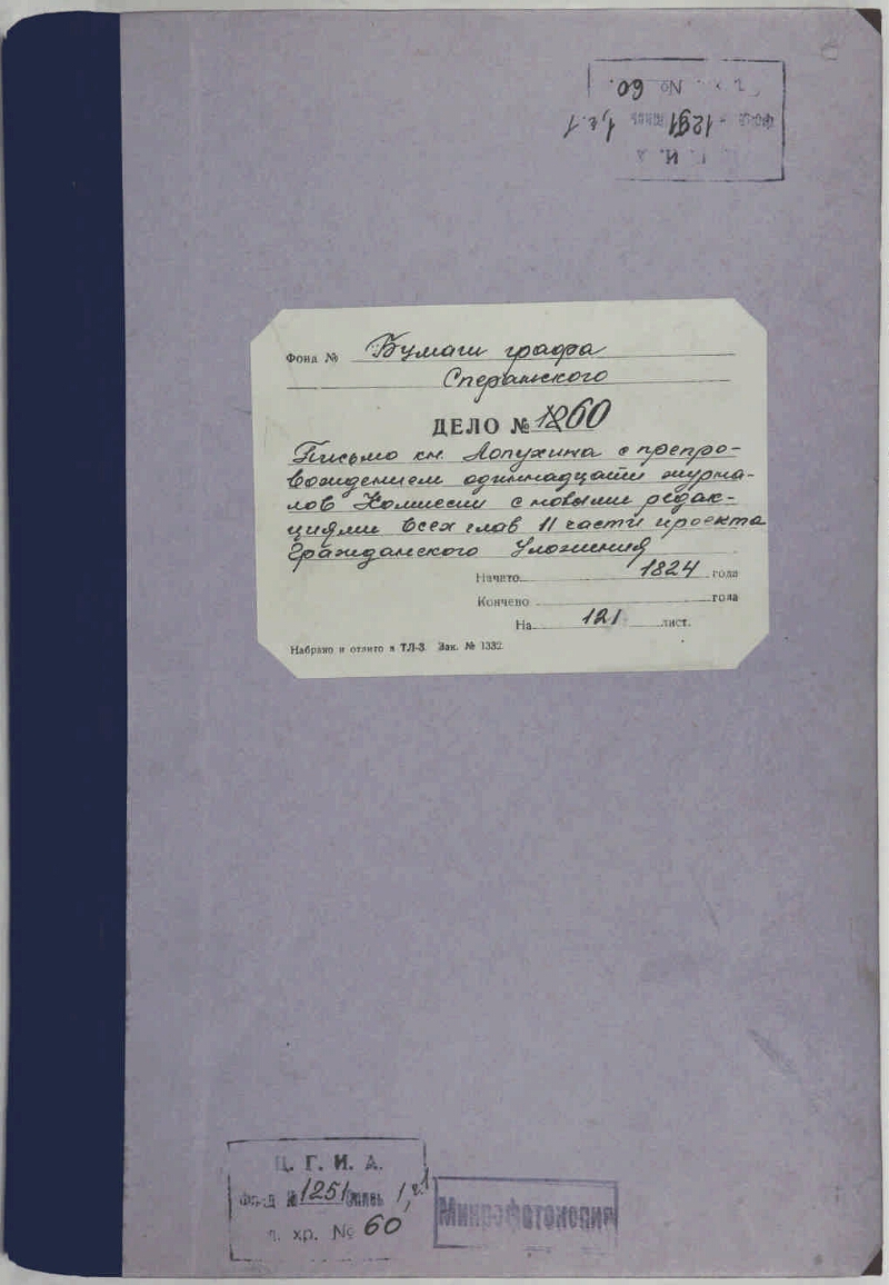 Письмо кн. Лопухина с препровождением одиннадцати журналов Комиссии с новыми редакциями всех глав 11 части проекта Гражданского уложения [Дело] : 1824 г. - 1824. -121 л.. - (Фонд Бумаги М. М. Сперанского. Опись № 1, часть 1)