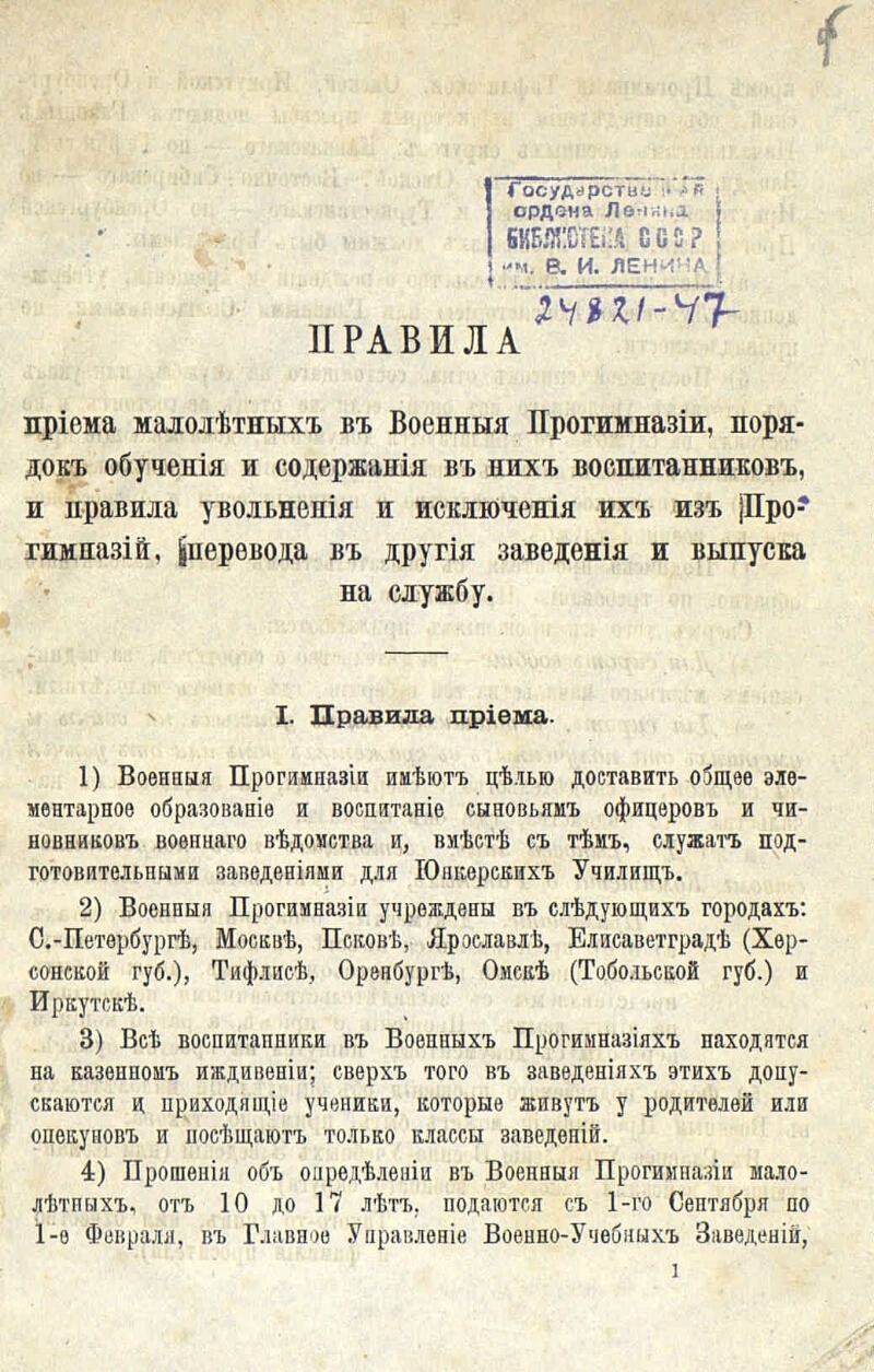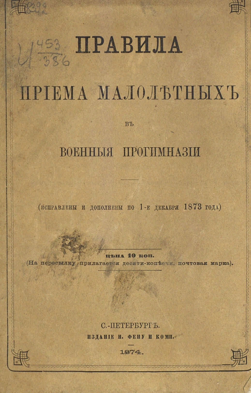 Правила приема малолетних в военные прогимназии : (исправлены и дополнены по 1-е декабря 1873 г.). - С.-Петербург : Н. Фену и К, 1874. - 26 с. ; 20 см. - Без тит. л.