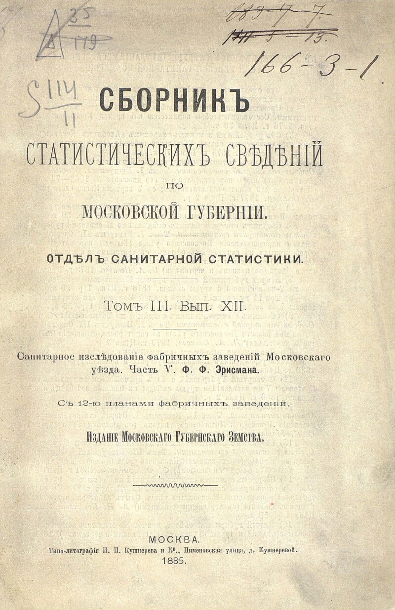 Т. 3, вып. 12: Санитарное исследование фабричных заведений Московского уезда. Ч. 5 / [соч.] Ф. Ф. Эрисмана. - 1885. - VI, 162, 26 с., 12 л. план.