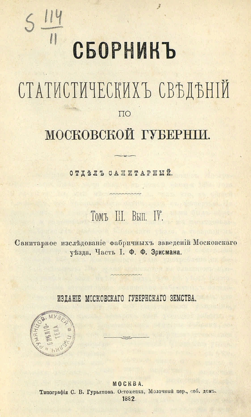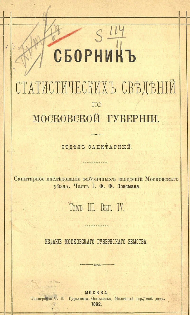 Т. 3, вып. 4: Санитарное исследование фабричных заведений Московского уезда. Ч. 1 / [соч.] Ф. Ф. Эрисмана. - 1882. - XII, 228 с., 15 л. диагр., карт.