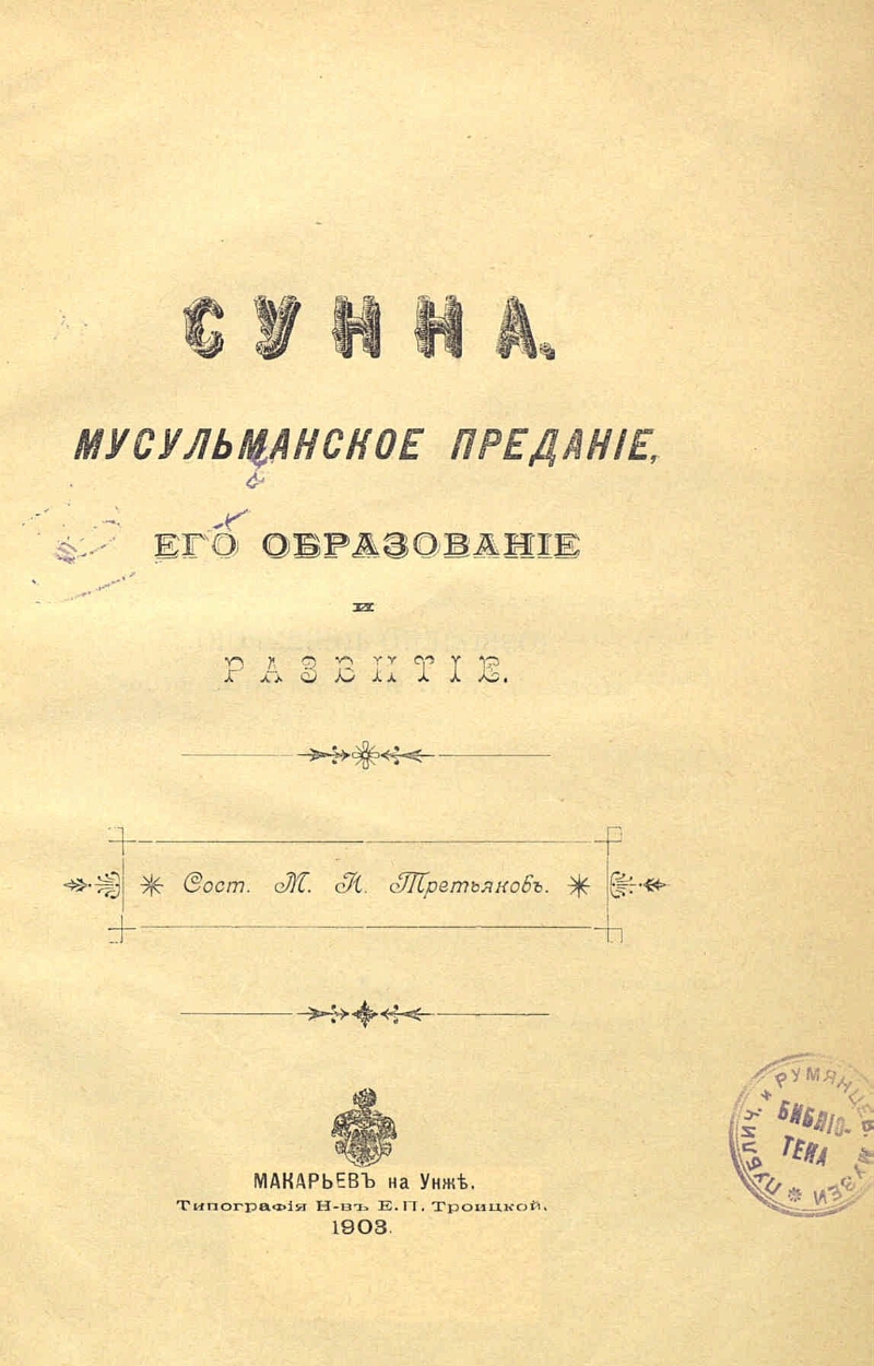 Автор Третьяков Михаил Иванович Описание Третьяков, Михаил Иванович Сунна : мусульманское предание, его образование и развитие / Сост. М. И. Третьяков. - Макарьев-на-Унже : Тип. н-в Е. П. Троицкой, 1903. - VI, 84 с. ; 24 см. - Библиогр. в примеч. . ББК 86.38 Источник копии: РГБМесто хранения оригинала: РГБ Издательство Тип. н-в Е. П. Троицкой Объект в каталогах Ислам (мусульманство)