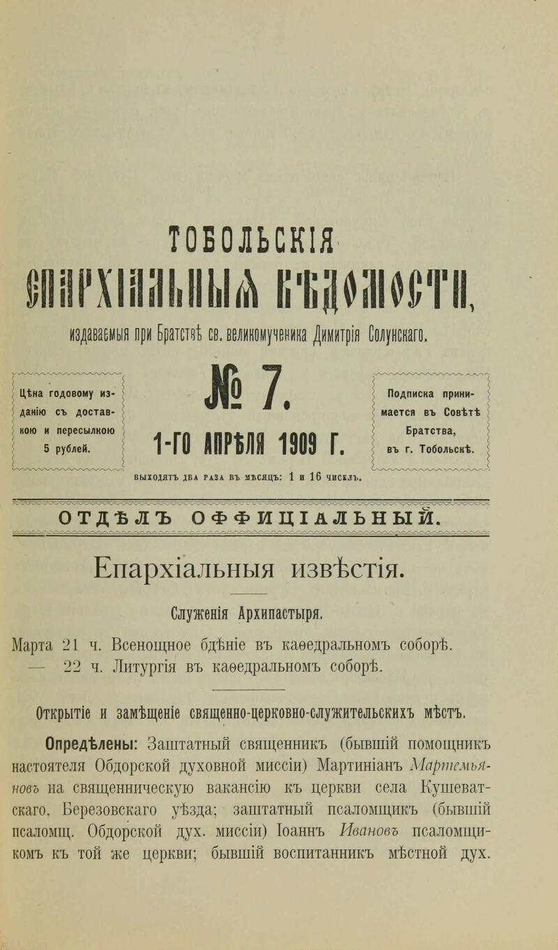 1909, № 7 : с приложением. - 48 с. разд. паг. - Загл. прил.: Школьный листок при Тобольск. епархиальн. ведомостях 1909 г. № 7. - Содерж.: Прибавление к сему № официальн. части: Список вакантных мест при церквах Тобольской епархии к 14 марта 1909 г.
