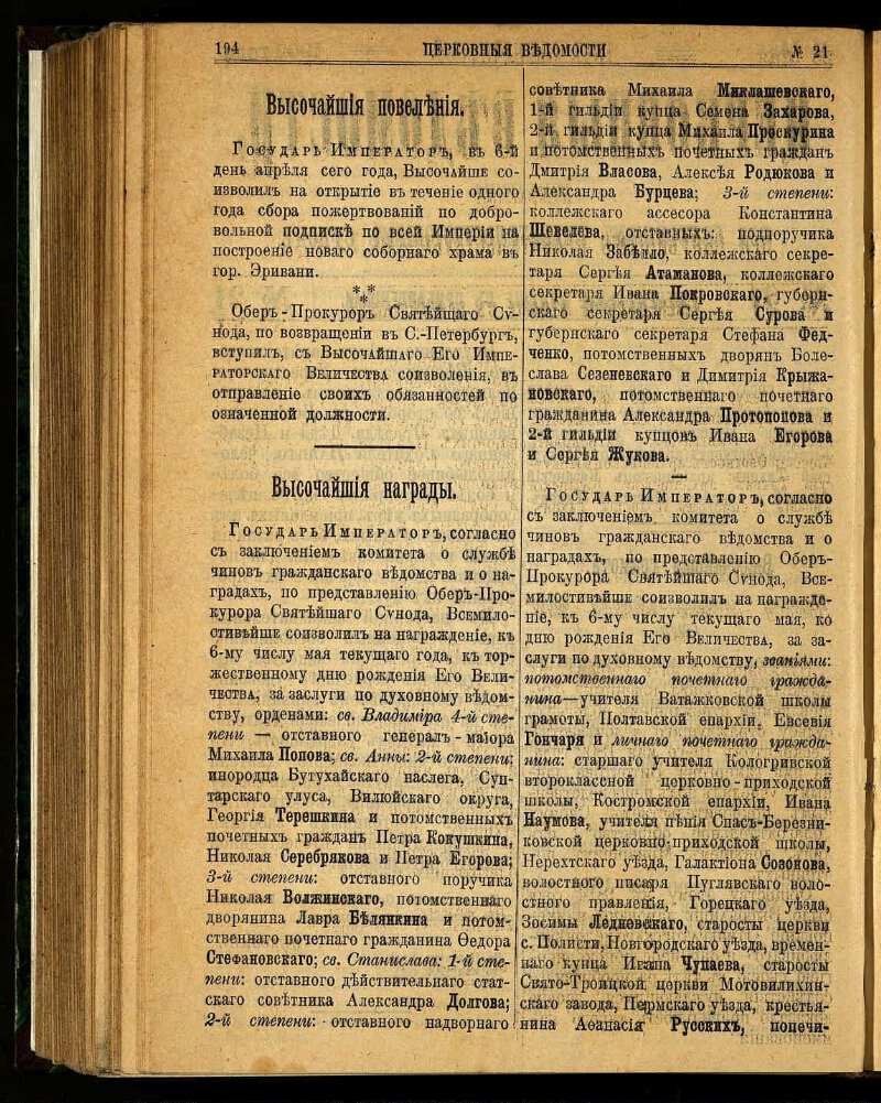 Церковные ведомости, издаваемые при Святейшем правительствующем Синоде : еженедельное издание с прибавлениями. - Санкт-Петербург, 1888-1918. - Выходит в 2-х частях: официальная и неофициальная. Неофициальная часть выходит под заглавием: Прибавления к Церковным ведомостям. За 1915-1916 гг. приложение к газете: Приходский листок. Заглавие: 1888-1917 № 8, 1918 № 1-3/4 Издаваемые при Святейшем правительствующем Синоде. Еженедельное издание с прибавлениями ; 1917 № 9/15-48/49 ... Еженедельное издание ; 1918 № 5-19/20 Издание православной русской церкви. Еженедельное издание с прибавлениями ; 1918 № 21/22 Издание православной русской церкви. Издание с прибавлениями ; 1918 № 23/24 Издание православной русской церкви. Издательство: 1918 № 1-3/4 Издательский совет при Святейшем Синоде ; 1918 № 5-23/24 Издательский совет при Священном Синоде. Приложения: Приходское чтение ; Определения Синода, молитвы, листовки, воззвания и т.п. : 101 брошюра. Алфавитно-предметный указатель к официальной части "Церковных ведомостей" за 1888-1897 годы : приложение к журналу. Санкт-Петербург, 1899. - Алфавитно-предметный указатель к официальной части "Церковных ведомостей" за 1898-1910 годы : приложение к журналу ... 1911, № 1-46. Санкт-Петербург, 1911.