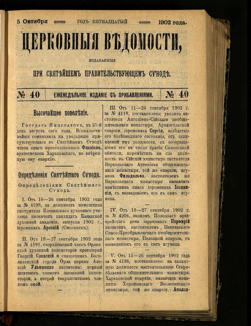 Церковные ведомости, издаваемые при Святейшем правительствующем Синоде : еженедельное издание с прибавлениями. - Санкт-Петербург, 1888-1918. - Выходит в 2-х частях: официальная и неофициальная. Неофициальная часть выходит под заглавием: Прибавления к Церковным ведомостям. За 1915-1916 гг. приложение к газете: Приходский листок. Заглавие: 1888-1917 № 8, 1918 № 1-3/4 Издаваемые при Святейшем правительствующем Синоде. Еженедельное издание с прибавлениями ; 1917 № 9/15-48/49 ... Еженедельное издание ; 1918 № 5-19/20 Издание православной русской церкви. Еженедельное издание с прибавлениями ; 1918 № 21/22 Издание православной русской церкви. Издание с прибавлениями ; 1918 № 23/24 Издание православной русской церкви. Издательство: 1918 № 1-3/4 Издательский совет при Святейшем Синоде ; 1918 № 5-23/24 Издательский совет при Священном Синоде. Приложения: Приходское чтение ; Определения Синода, молитвы, листовки, воззвания и т.п. : 101 брошюра. Алфавитно-предметный указатель к официальной части "Церковных ведомостей" за 1888-1897 годы : приложение к журналу. Санкт-Петербург, 1899. - Алфавитно-предметный указатель к официальной части "Церковных ведомостей" за 1898-1910 годы : приложение к журналу ... 1911, № 1-46. Санкт-Петербург, 1911.