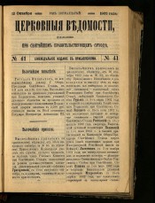 Церковные ведомости, издаваемые при Святейшем правительствующем Синоде : еженедельное издание с прибавлениями. - Санкт-Петербург, 1888-1918. - Выходит в 2-х частях: официальная и неофициальная. Неофициальная часть выходит под заглавием: Прибавления к Церковным ведомостям. За 1915-1916 гг. приложение к газете: Приходский листок. Заглавие: 1888-1917 № 8, 1918 № 1-3/4 Издаваемые при Святейшем правительствующем Синоде. Еженедельное издание с прибавлениями ; 1917 № 9/15-48/49 ... Еженедельное издание ; 1918 № 5-19/20 Издание православной русской церкви. Еженедельное издание с прибавлениями ; 1918 № 21/22 Издание православной русской церкви. Издание с прибавлениями ; 1918 № 23/24 Издание православной русской церкви. Издательство: 1918 № 1-3/4 Издательский совет при Святейшем Синоде ; 1918 № 5-23/24 Издательский совет при Священном Синоде. Приложения: Приходское чтение ; Определения Синода, молитвы, листовки, воззвания и т.п. : 101 брошюра. Алфавитно-предметный указатель к официальной части "Церковных ведомостей" за 1888-1897 годы : приложение к журналу. Санкт-Петербург, 1899. - Алфавитно-предметный указатель к официальной части "Церковных ведомостей" за 1898-1910 годы : приложение к журналу ... 1911, № 1-46. Санкт-Петербург, 1911.