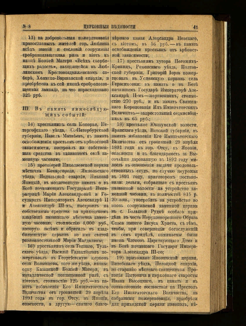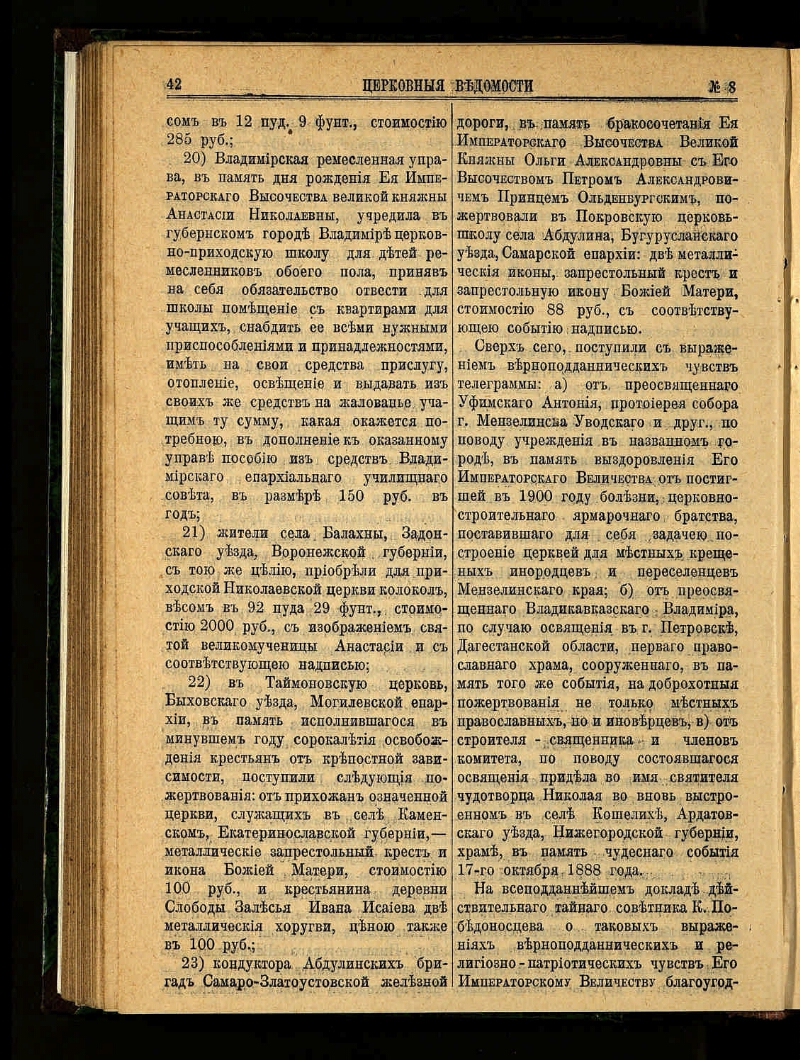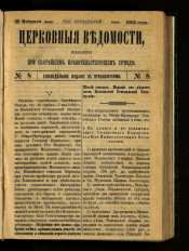 Церковные ведомости, издаваемые при Святейшем правительствующем Синоде : еженедельное издание с прибавлениями. - Санкт-Петербург, 1888-1918. - Выходит в 2-х частях: официальная и неофициальная. Неофициальная часть выходит под заглавием: Прибавления к Церковным ведомостям. За 1915-1916 гг. приложение к газете: Приходский листок. Заглавие: 1888-1917 № 8, 1918 № 1-3/4 Издаваемые при Святейшем правительствующем Синоде. Еженедельное издание с прибавлениями ; 1917 № 9/15-48/49 ... Еженедельное издание ; 1918 № 5-19/20 Издание православной русской церкви. Еженедельное издание с прибавлениями ; 1918 № 21/22 Издание православной русской церкви. Издание с прибавлениями ; 1918 № 23/24 Издание православной русской церкви. Издательство: 1918 № 1-3/4 Издательский совет при Святейшем Синоде ; 1918 № 5-23/24 Издательский совет при Священном Синоде. Приложения: Приходское чтение ; Определения Синода, молитвы, листовки, воззвания и т.п. : 101 брошюра. Алфавитно-предметный указатель к официальной части "Церковных ведомостей" за 1888-1897 годы : приложение к журналу. Санкт-Петербург, 1899. - Алфавитно-предметный указатель к официальной части "Церковных ведомостей" за 1898-1910 годы : приложение к журналу ... 1911, № 1-46. Санкт-Петербург, 1911.